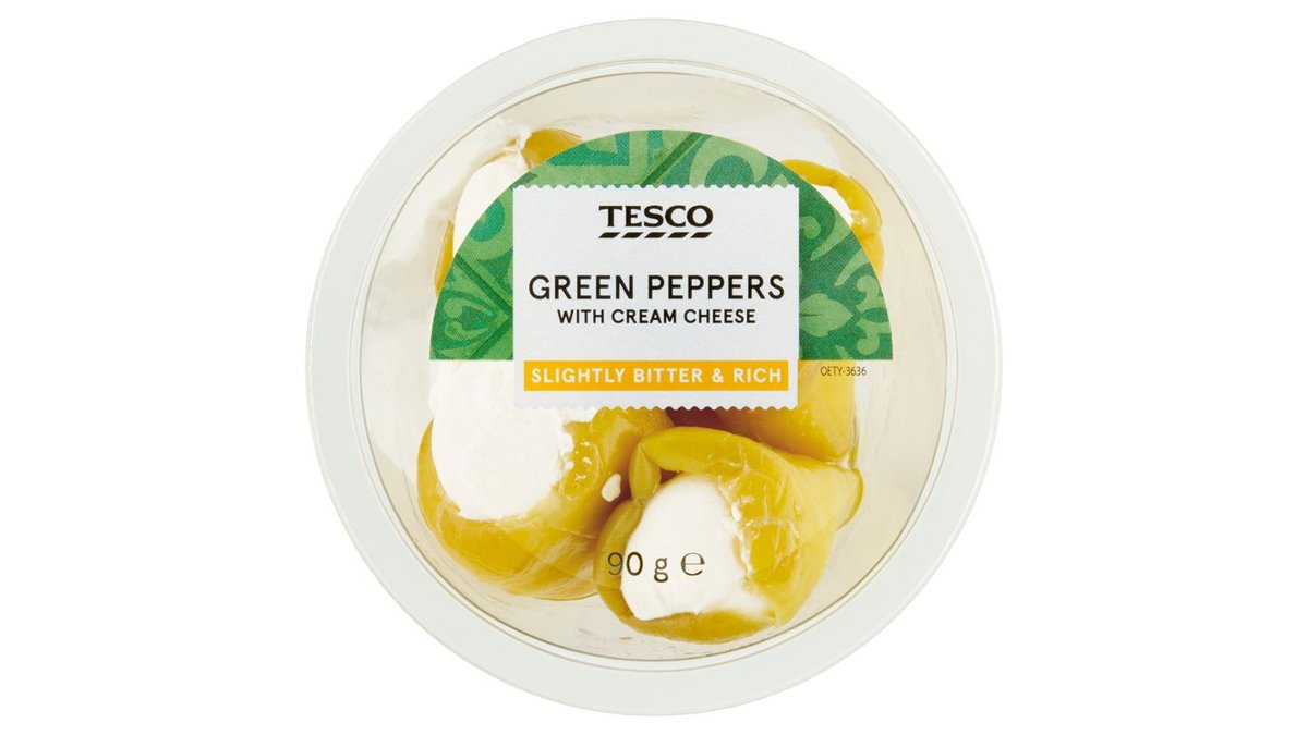 Tesco Marinované zelené a červené papričky plnené krémovým syrom v repkovom oleji s olivami 150 g