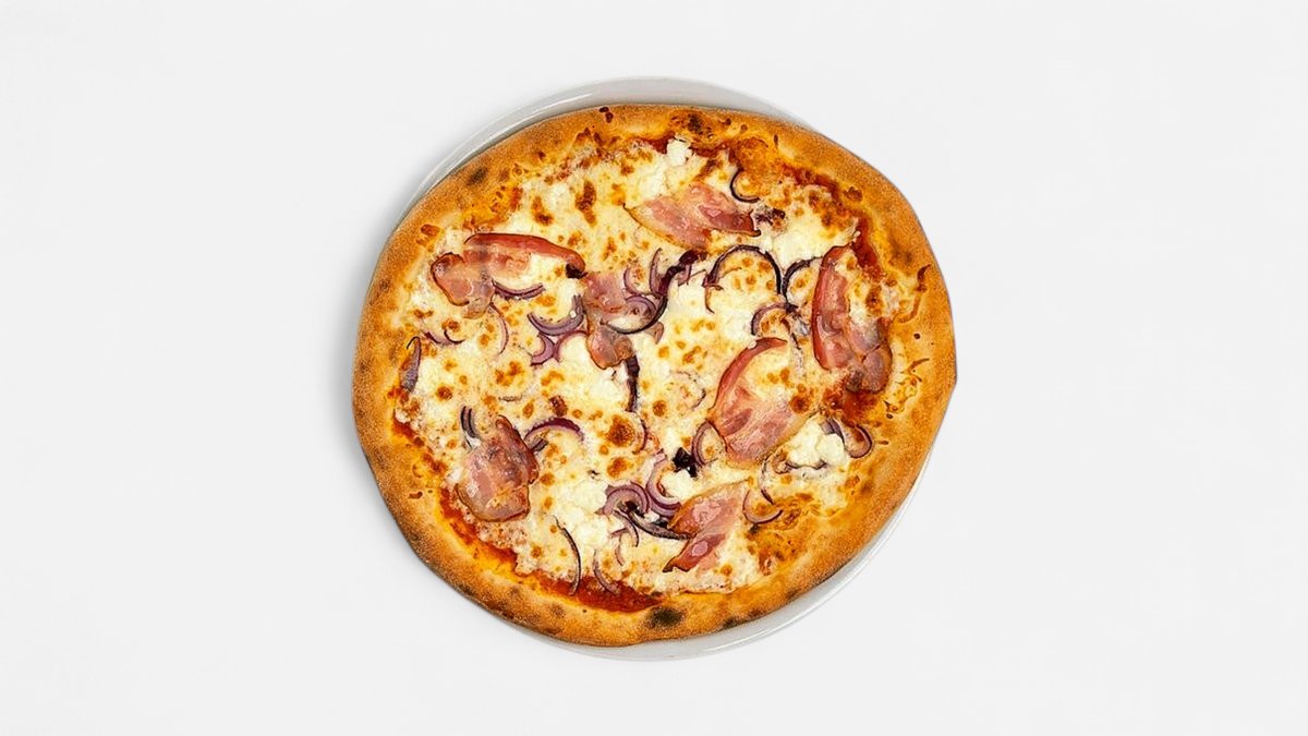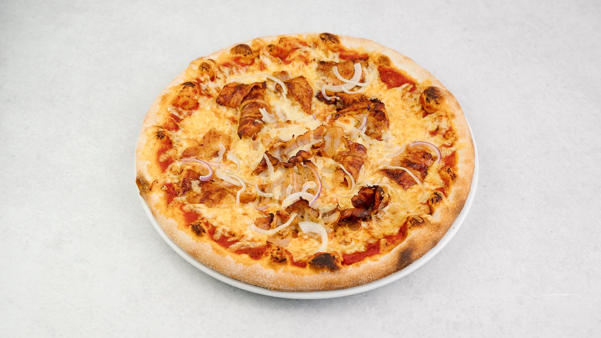 590g cesto, paradajkový základ, škvarky, červená cibuľa, syr, oregano