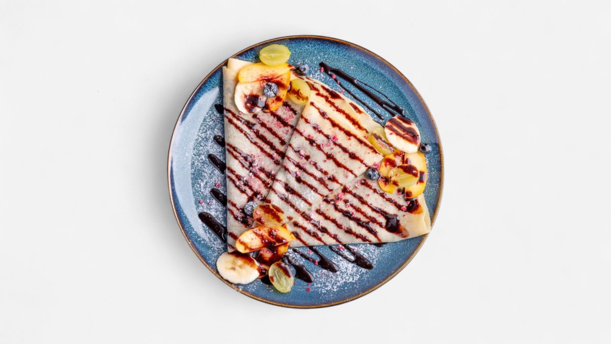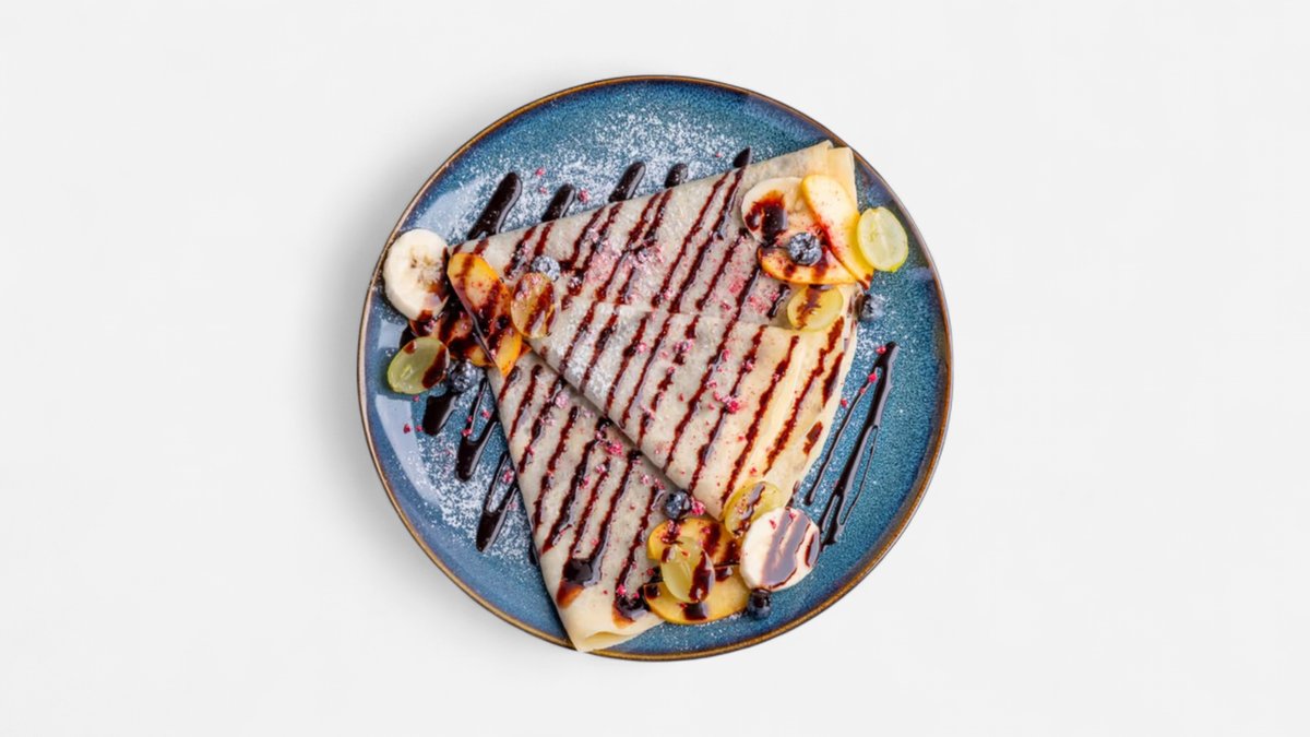 3 kusy palacinky plnené domácim jahodovým lekvárom, poliate mliečnou čokoládou, posypané kúskami mandlí.
