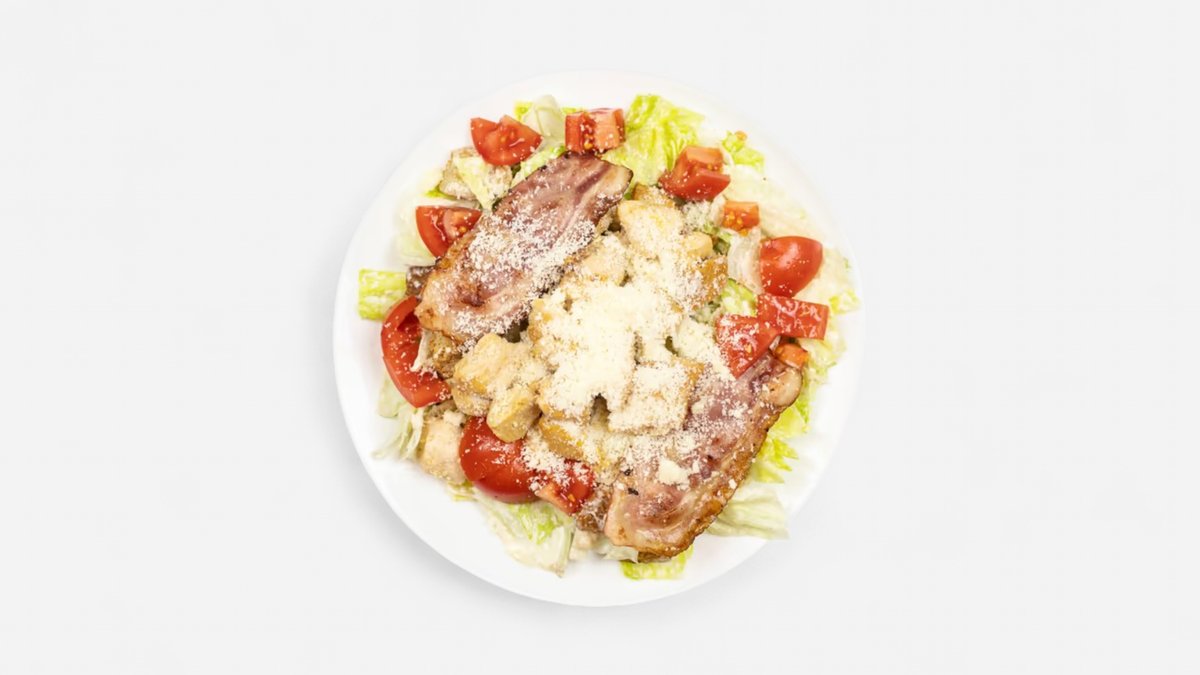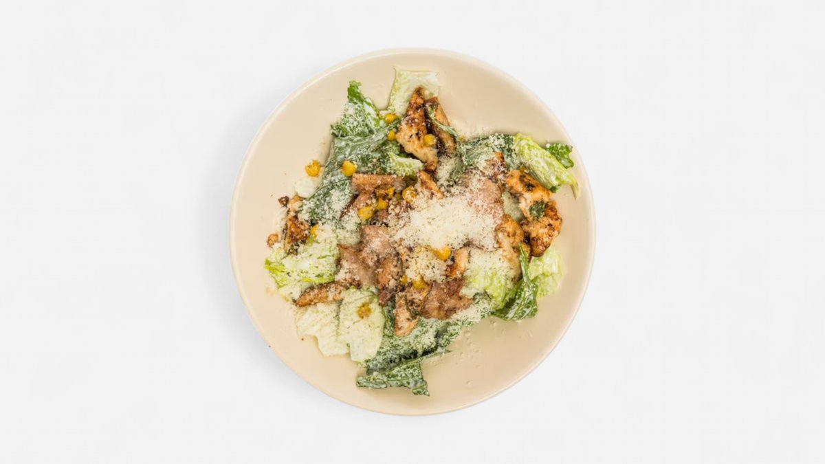 425g ľadový šalát, kuracie prsia, parmezán, cherry paradajky, olivy, korenie na grilovanie, cézar dressing