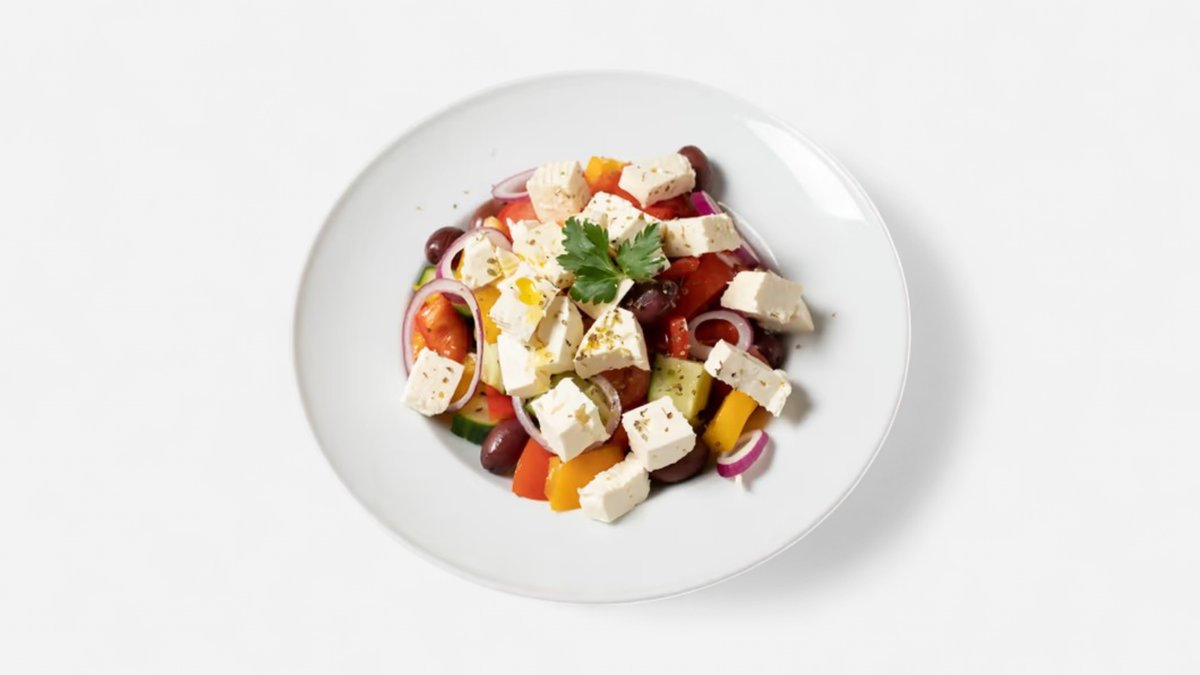 420g šalátová uhorka, cherry paradajky, paprika, červená cibuľa, čierne olivy, Balkánsky syr, olivový olej, oregano