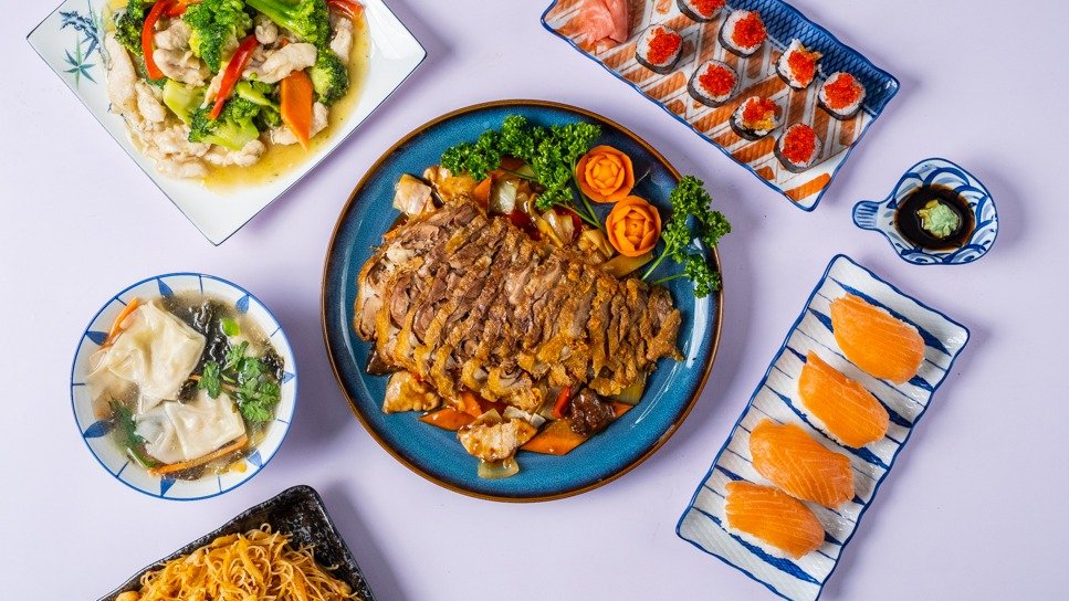 Chrumkavá kačica, žltá reďkovka, syr, California roll