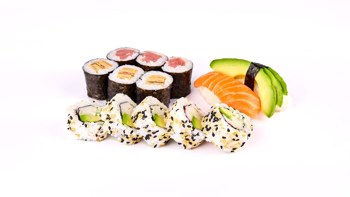 maki: 6ks losos, 3ks avokádo, 3ks uhorka; sashimi: 4ks losos; futomaki: 10x losos, avokádo, uhorka, reďkovka