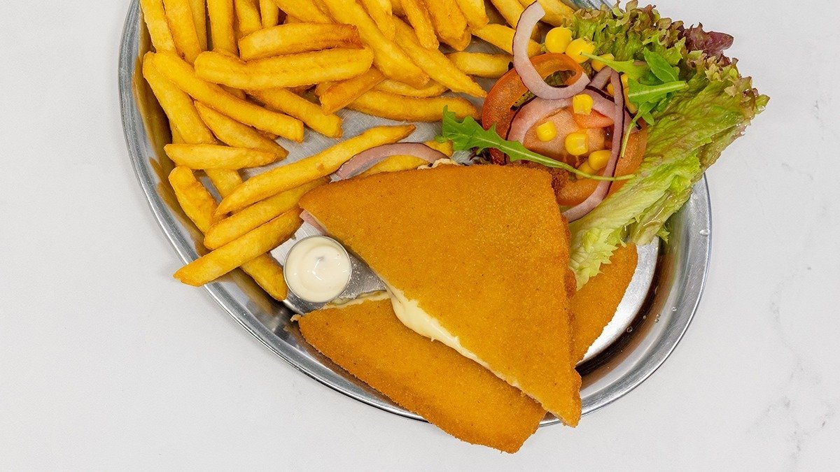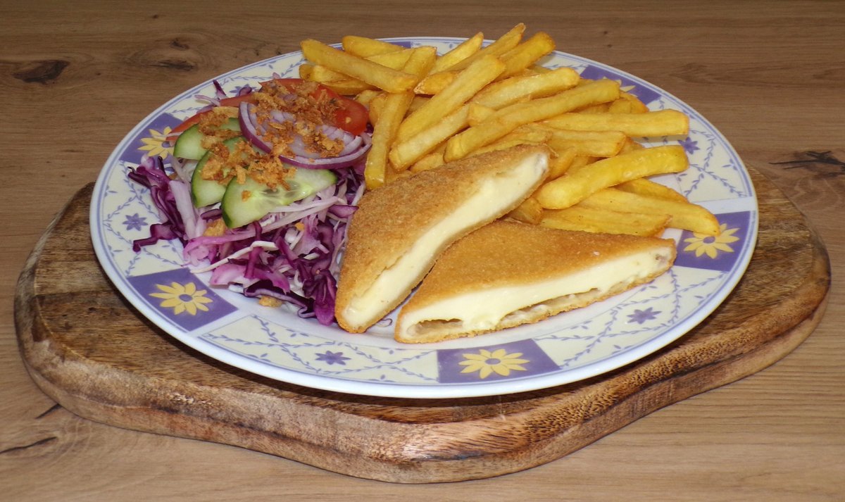 hranolky 200g + vyprážaný syr 120g + dresing + zeleninová obloha + Coca Cola 330ml 350g / obsahuje: 1, 3, 7, 12