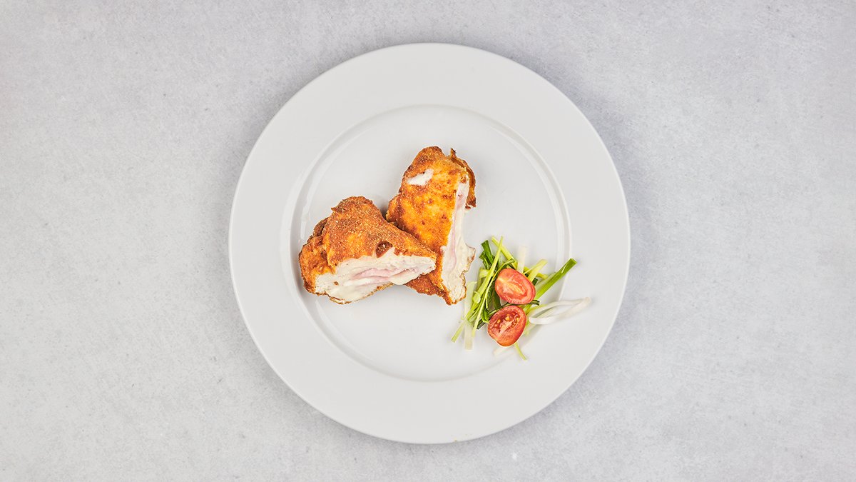 Vyprážaný kurací rezeň plnený šunkou a syrom, zeleninová obloha
