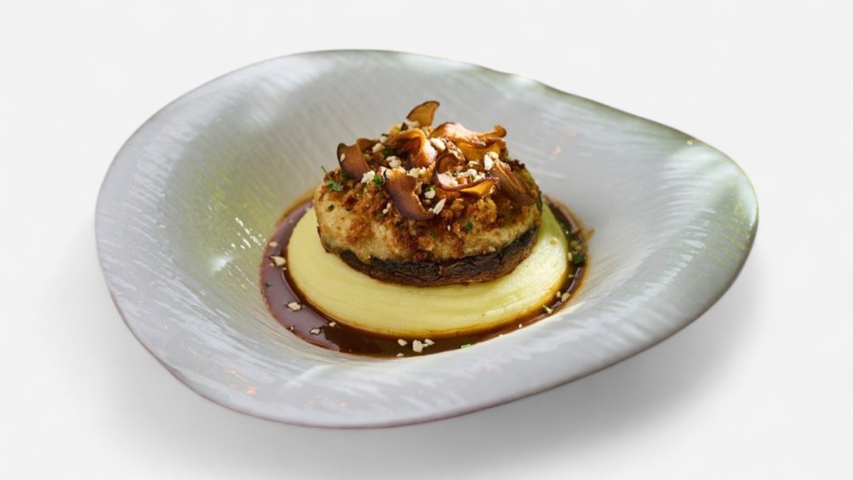 Portobello steak, soufflé z mascarpone, truffle omáčka, bylinkové panko crumble, zemiaková kaša