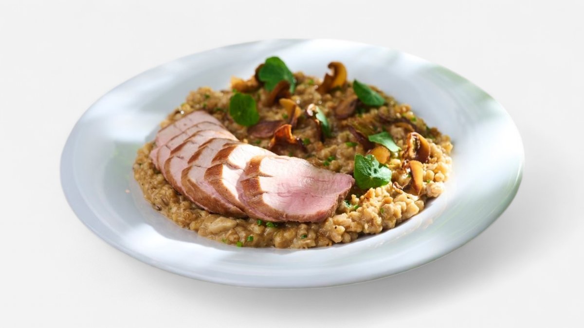 Grilovaná bravčová panenka, jablkovo-cibuľový jus, horčicový med, krupoto s pečeným cesnakom a lesnými hubami