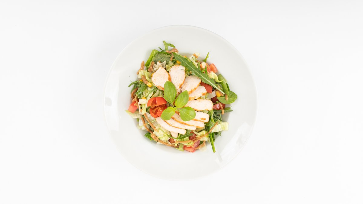 kuracie mäso (200g), ľadový sálať, paradajka, červená cibuľa, BBQ dressing + nápoj 0,33l 900 g / obsahuje: 1, 7, 10, 12