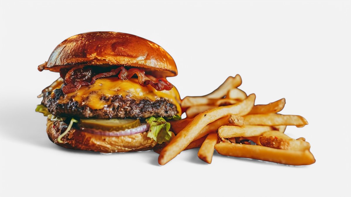 100% írske hovädzie mäso 150g, domáca žemľa 90g, ľadový šalát, slanina, dresing z údenej slaninky, kyslá uhorka, paradajky, cibuľa, cheddar, burgrový dresing, hranolky obsahuje: 1,3,7 Ilustračná fotografia