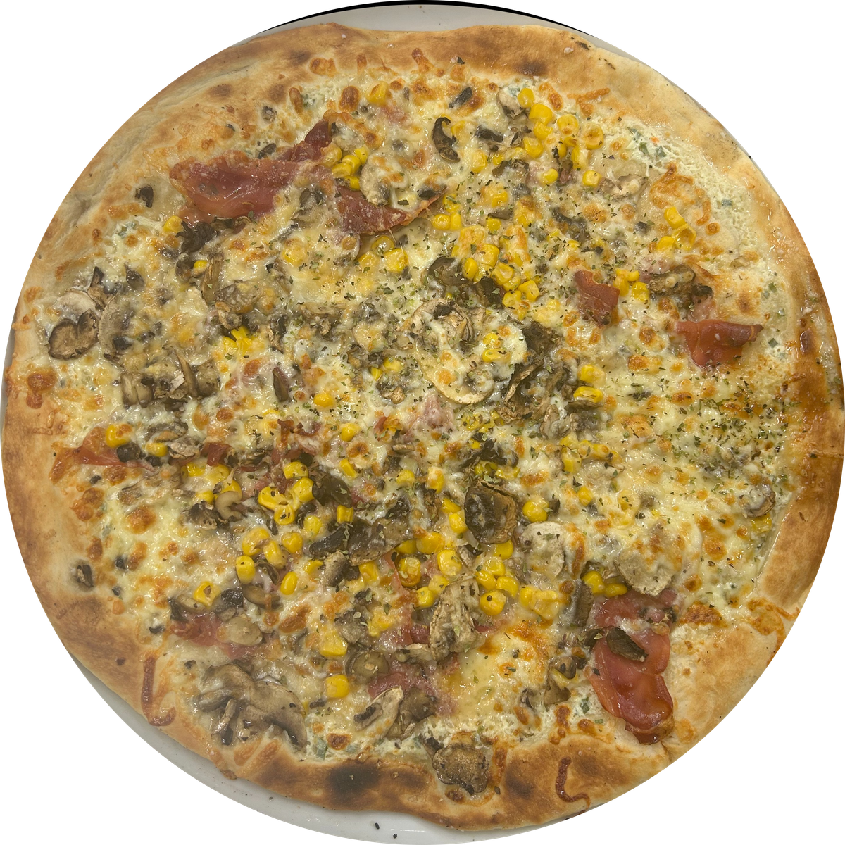 rajč. omáčka, mozzarella, šunka, kukurica, slanina, feferóny 400g / obsahuje: 1,7 Ilustračná fotografia.