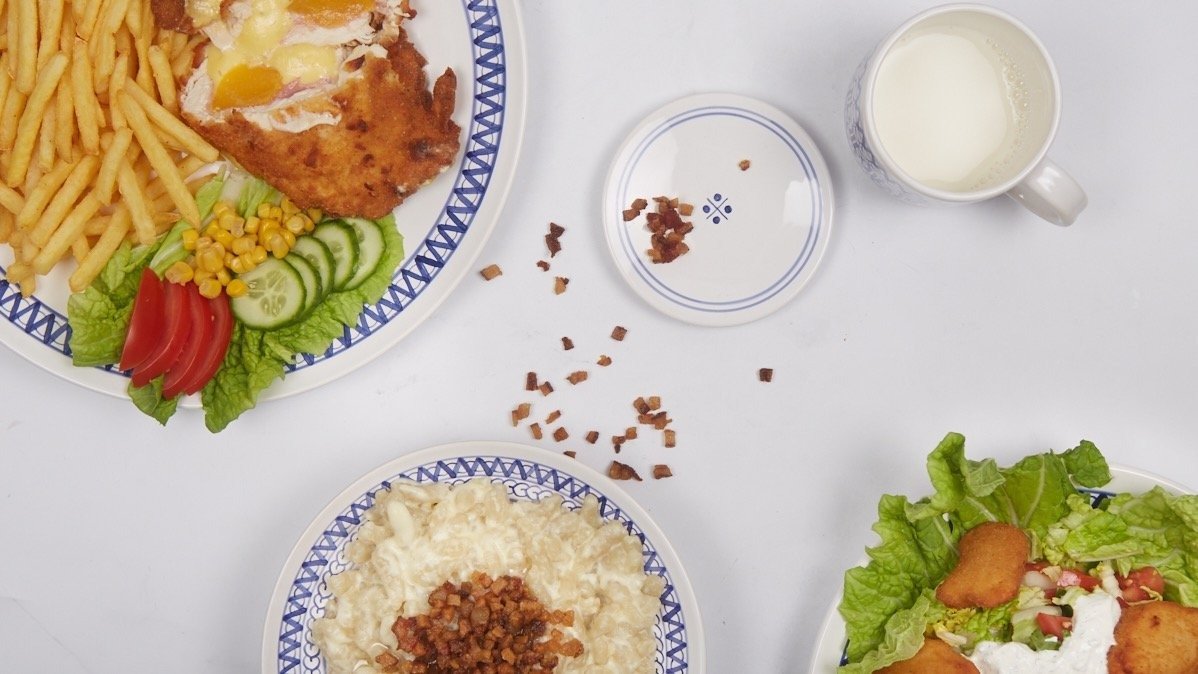 Nedeľa M1 / Vyprážaný kurací rezeň, varené zemiaky, kyslá uhorka
