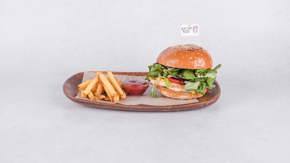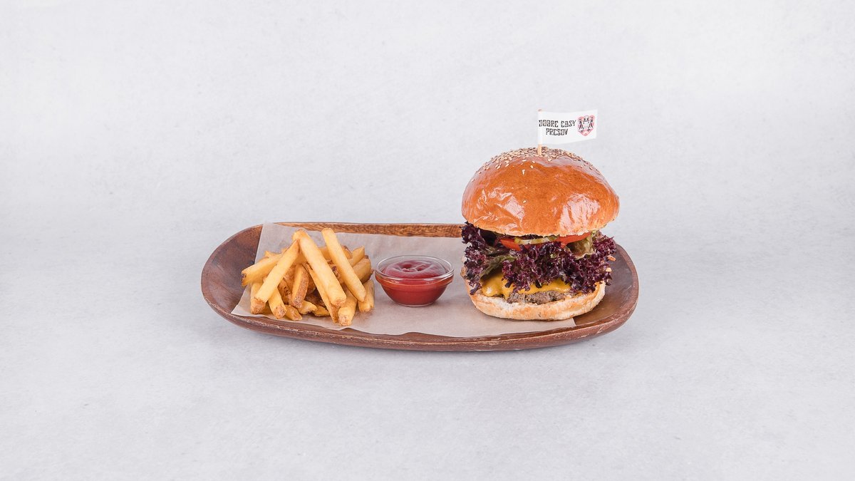 hovädzie mleté, chedar, slanina, dobrý dresing, hranolky, kečup 150/200/100 g / obsahuje: 1, 3, 6, 7, 10