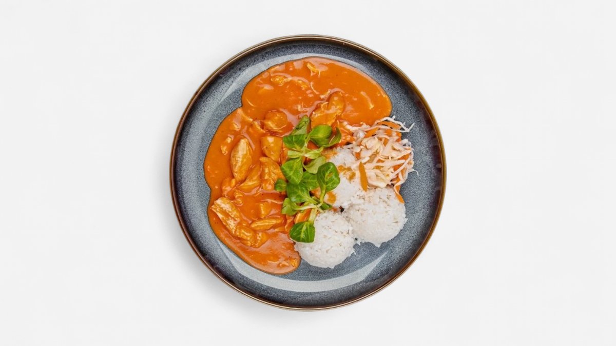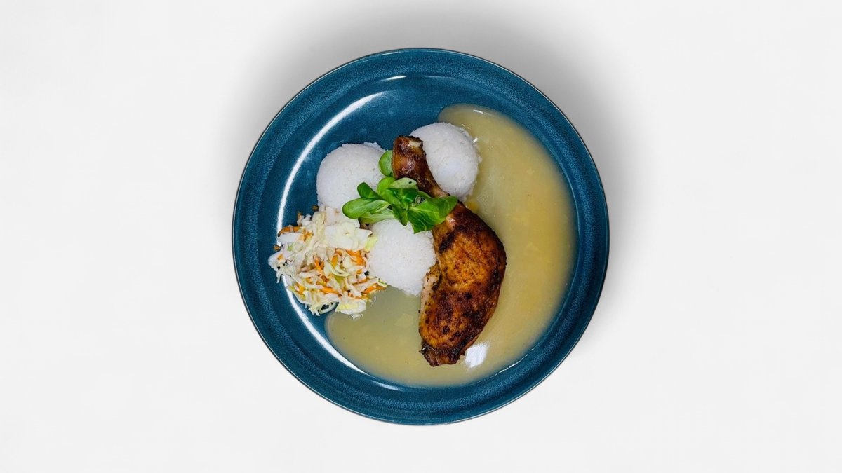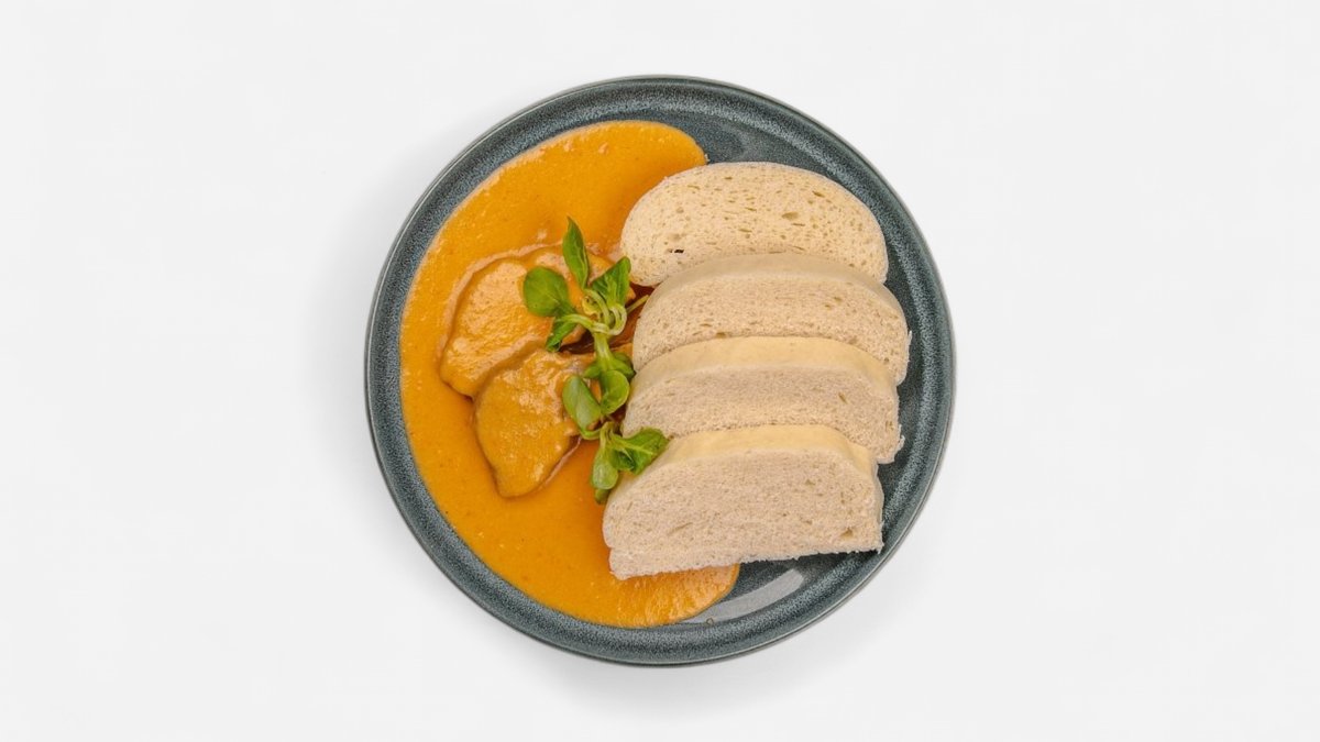 Kuracie stehno, papriková omáčka, zemiakovo-maslové halušky. 400 g / obsahuje: 1,3,7,9
