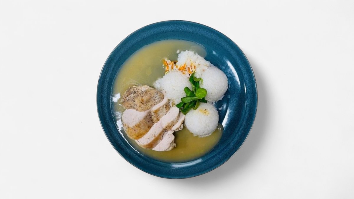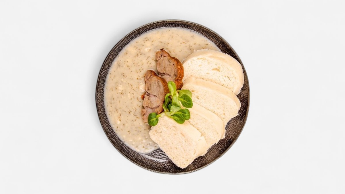 Pečená krkovička alebo hovädzie predné plece za príplatok, kôprová omáčka, parená knedľa. 400 g / obsahuje: 1,3,7