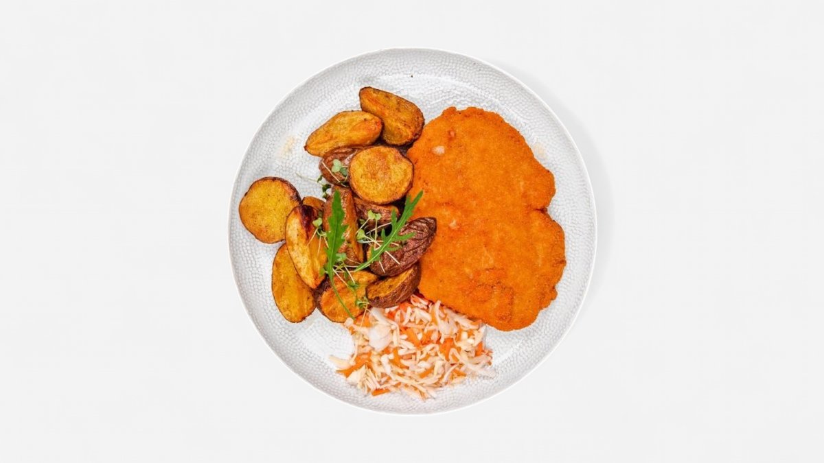 Sedliacky kurací plátok, opekané zemiaky, mrkvovo-kapustový šalát