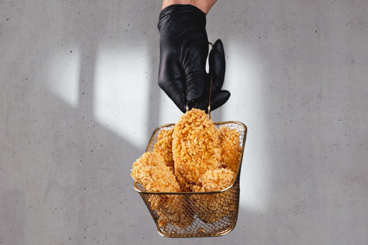 4x cibuľové krúžky, 4x kuracie krídelka, 3x kuracie kúsky, 1x 150g hranolky, 1x 150g batatové hranolky, 3x dresing podľa vlastného výberu