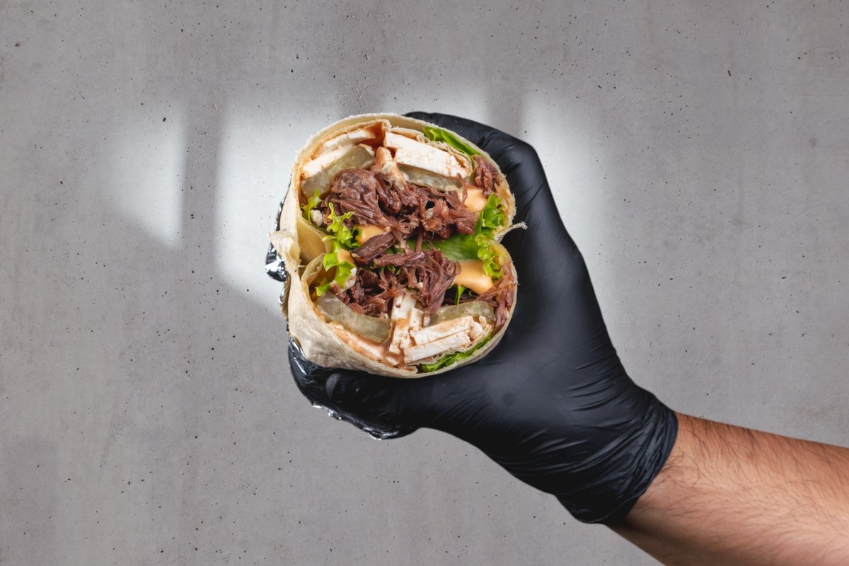 30cm tortilla, 130g trhané bravčové mäsko, 50g cheddar, chrumkavá slaninka, grilovaná kukurica, grilovaná červená cibuľka, BBQ + dresing podľa vlastného výberu (3 trojuholníčky)
