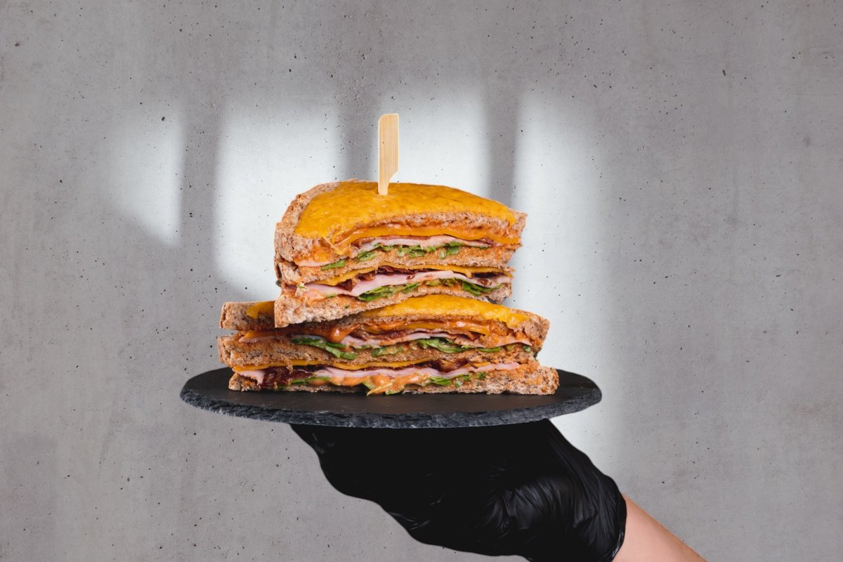 3x Sendvič, 3x chrumkavá slaninka, 2x šunka, 3x cheddar, polníček, domáca medovo-horčicová mayo. (250g) /1,3,7,10/