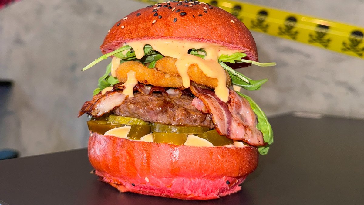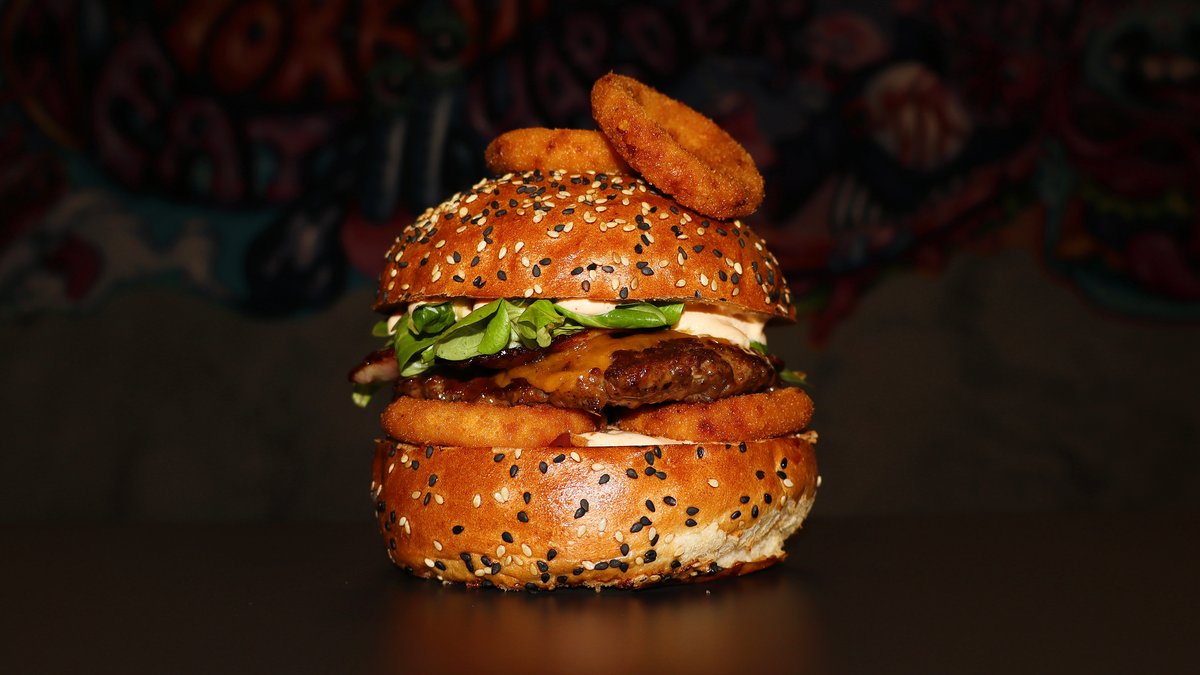 Brioš žemľa, 100% 150g hovädzie mäso, 4x cibuľové krúžky, cheddar, grilovaná červená cibuľka, chrumkavá slaninka, polníček, domáci cesnakový dresing. (360g) /1,3,7,10,11,12/
