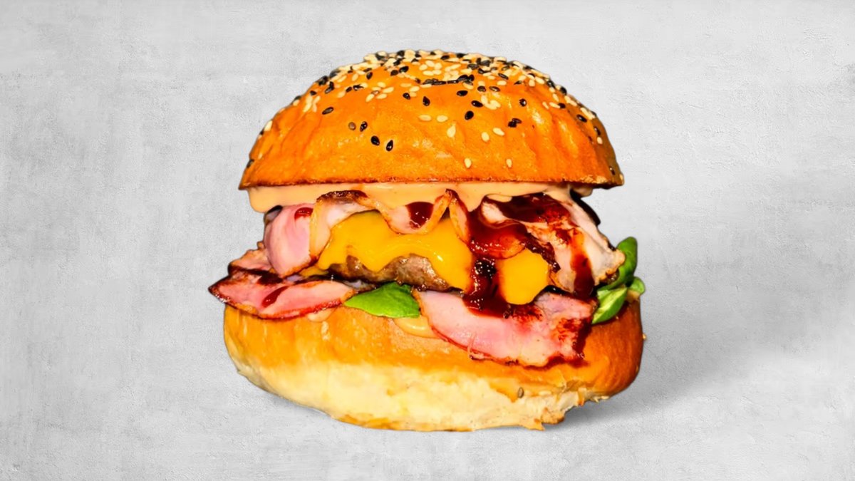 Brioš žemľa, 100% 150g hovädzie mäso, cheddar, chrumkavá slaninka, grilovaná červená cibuľka, ľadový šalát, paradajka, kyslá uhorka, jemne údená domáca smooth BBQ. (320g) /1,3,7,10,11/