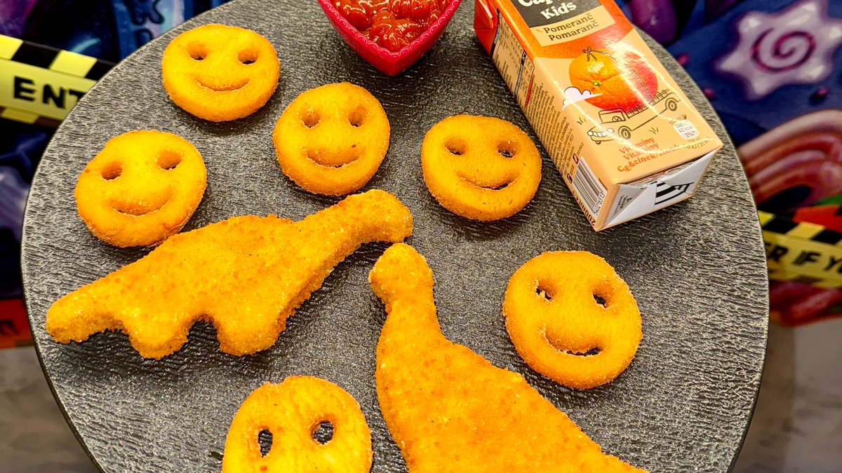 200g, 80g zemiakove smajlíky 6ks, 120g kuracie dinosaury 2ks, 50g kečup, malý džusik podľa aktualnej ponuky