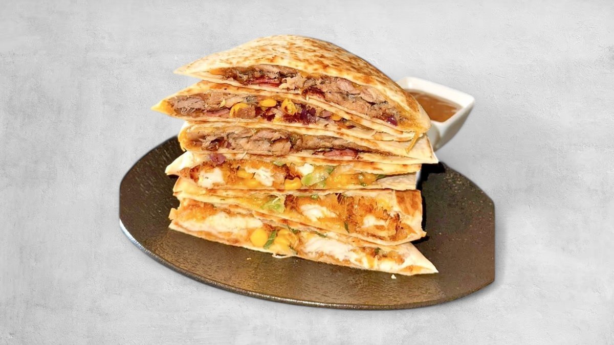 30cm tortilla, 80g cheddar, 30g monterrey jack, grilovaná kukurica, grilovaná červená cibuľka + dresing podľa vlastného výberu (3 trojuholníčky)