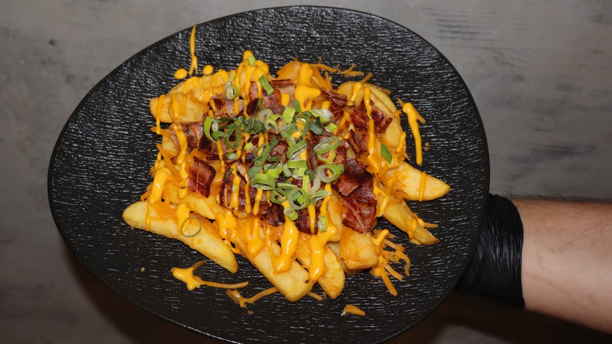 200g hranolky, jalapeňo, slaninka, cheddar, sušená cibuľka, červená cibuľka, jarná cibuľka, chedarrová omáčka, dresing podľa vlastného výberu