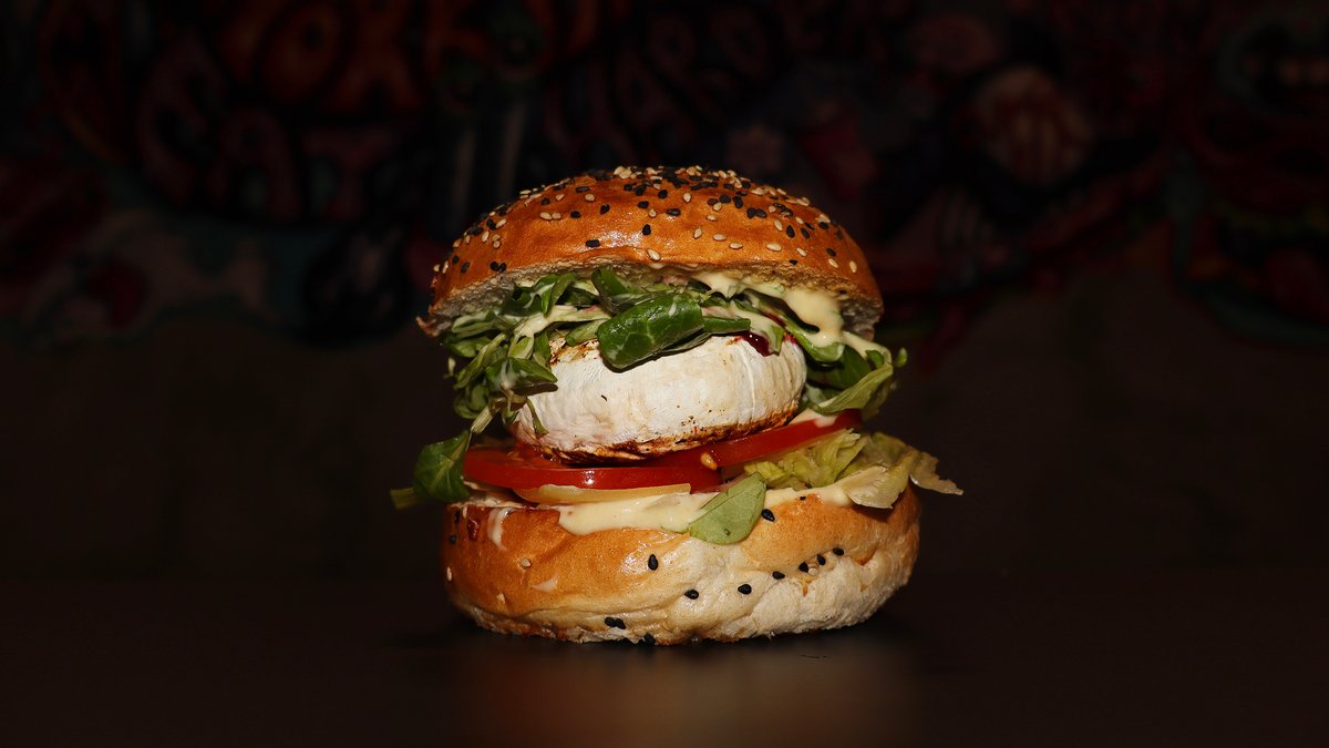 Brioš žemľa, 100g grilovaný Hermelín, ľadový šalát, paradajka, polníček, brusnicová omáčka, domáca medovo-horčicová mayo. (260g) /1,3,7,10,11/