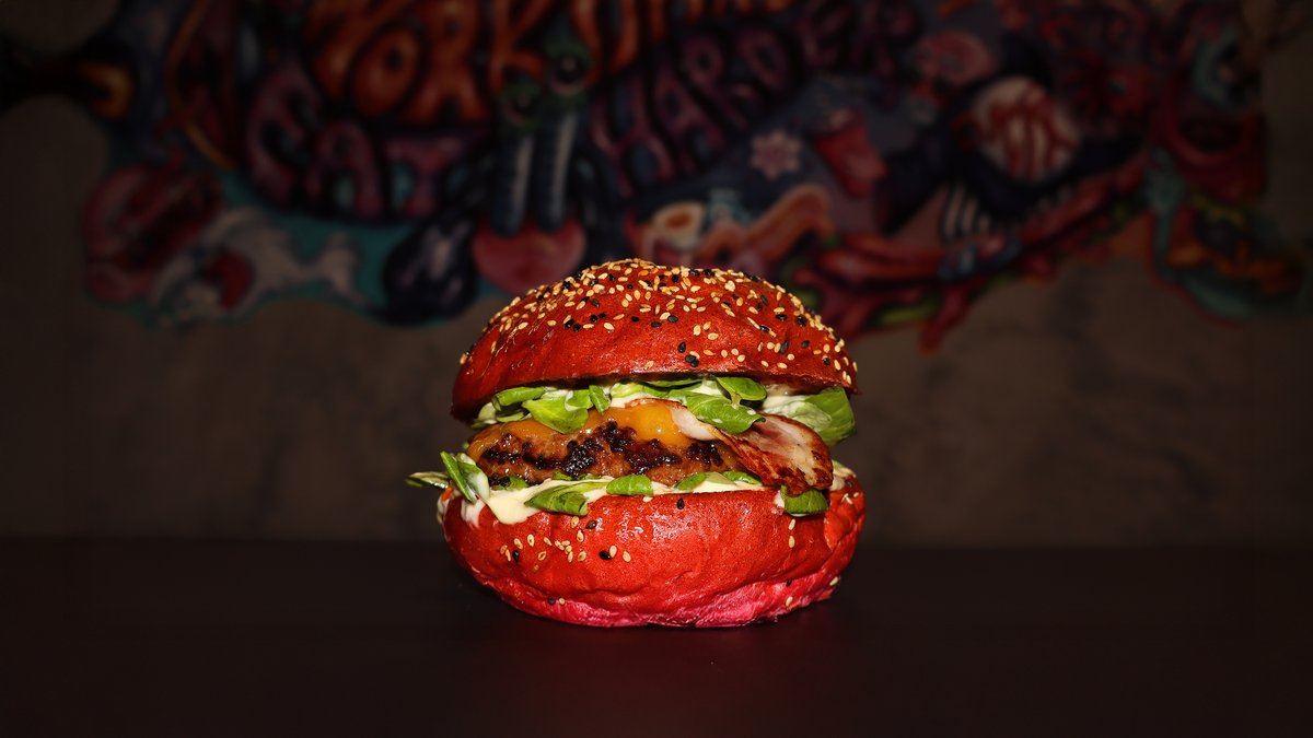Brioš žemľa, 100% 150g hovädzie mäso, volské oko, Monterey Jack, chrumkavá slaninka, polníček, domáca sweet chilli mayo. (350g) /1,3,7,10,11/
