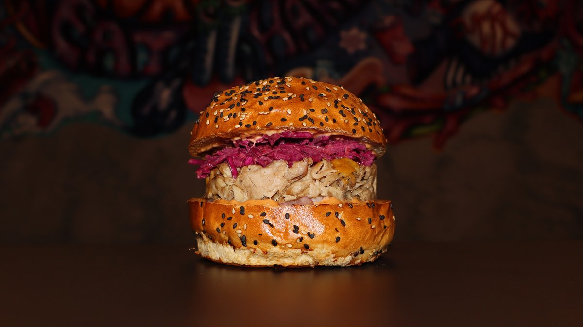 Brioš žemľa, trhané bravčové mäso, grilovaná červená cibuľka, cheddar, chrumkavá slaninka, jemne údená domáca smooth BBQ (330g) /1,3,7,10,11/