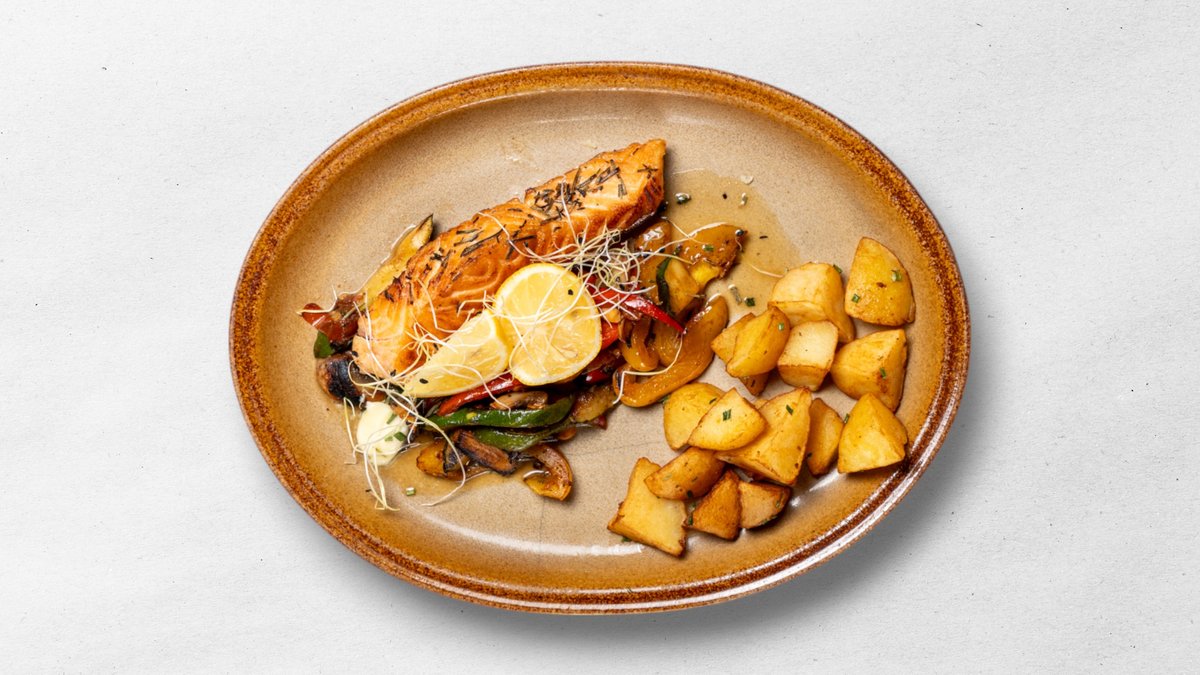 Losos s grilovanou zeleninou, opekané zemiaky