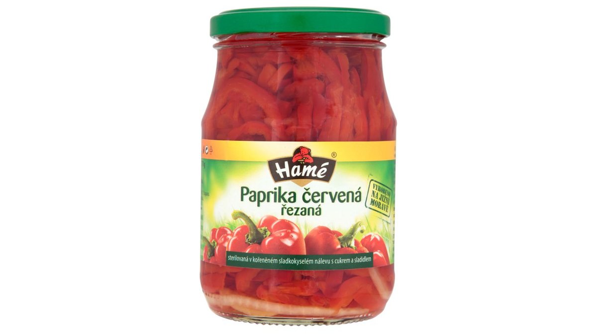Hamé Červená paprika rezaná v korenenom sladkokyslom náleve s cukrom a sladidlami 340 g