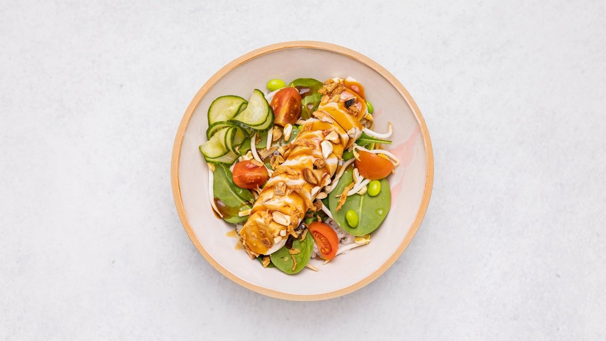 kuracie prsia, sushi ryža, cherry rajčiny, špenát, edamame, mungo klíčky, nakladaná uhorka, fritovaná cibuľka, keshu oriešky, teriyaki omáčka 480 g / obsahuje: 1, 6, 8