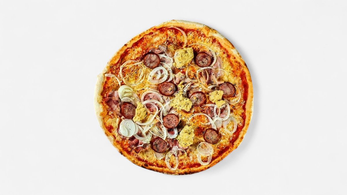 paradajkový základ, syr, saláma, klobása, slanina, červená cibuľa, feferónky 600g / obsahuje: 1,7