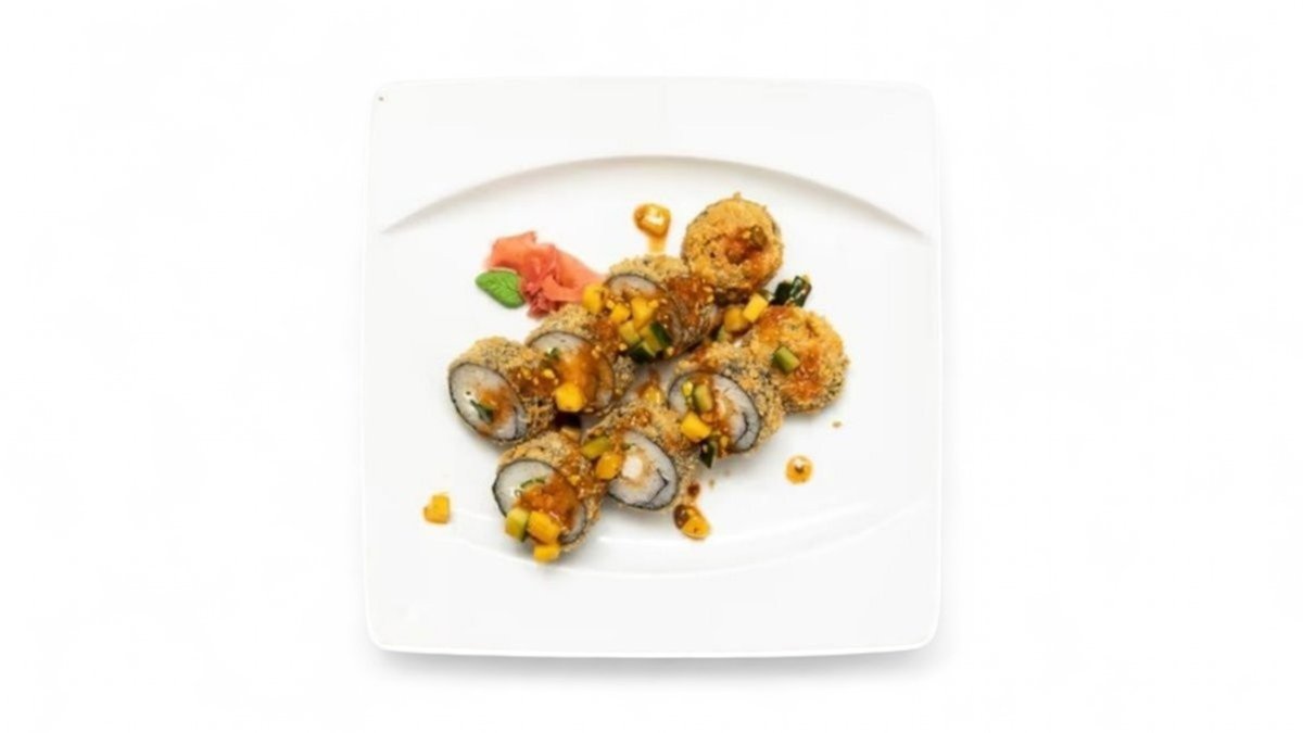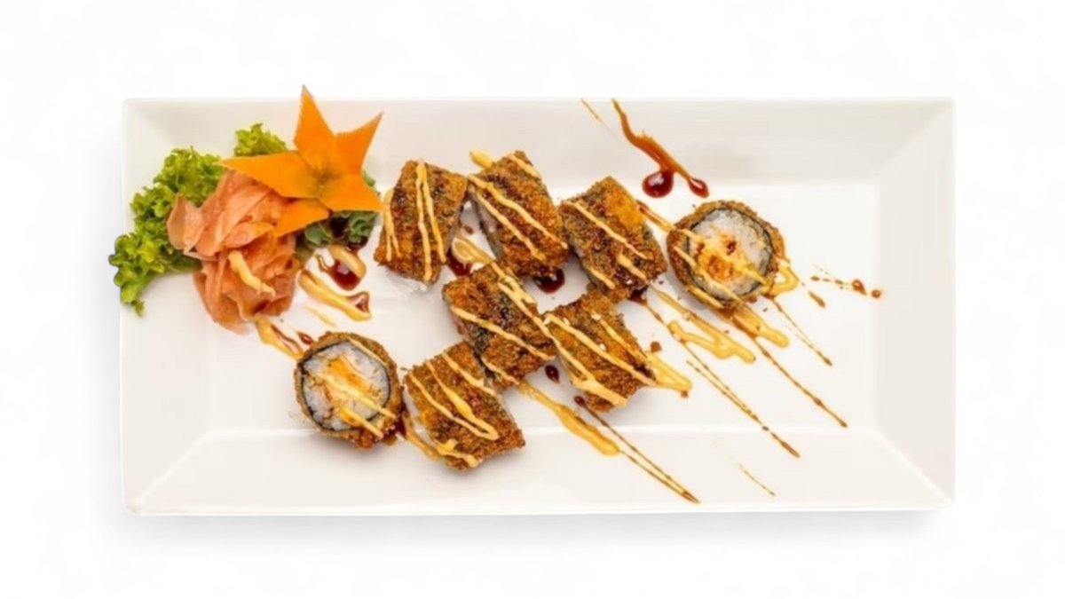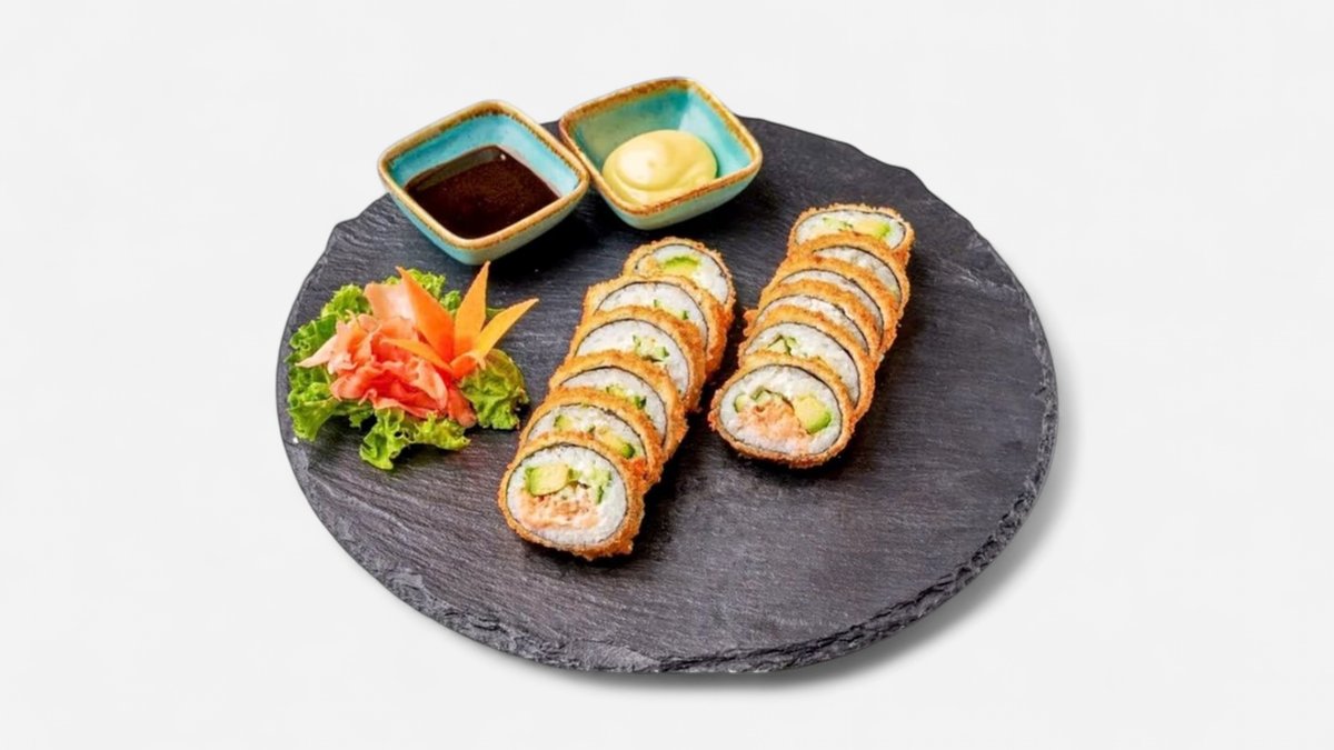 Tempurovaná rolka s tuniako, avokádom, mrkvou, uhorkou, japonskou majonézou, philadelphiou, ocean omáčkou, sezamom. 12ks (1,3,4,6,7,10,12)