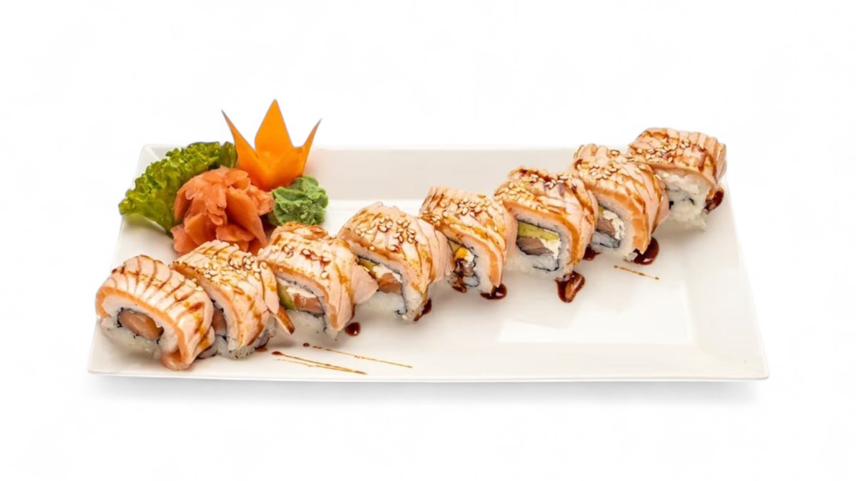 Tempurovaná rolka s lososom, avokádom, uhorkou, japonskou majonézou, ocean omáčkou, philadelphiou, sezamom. 12ks (1,3,4,6,7,10,12)