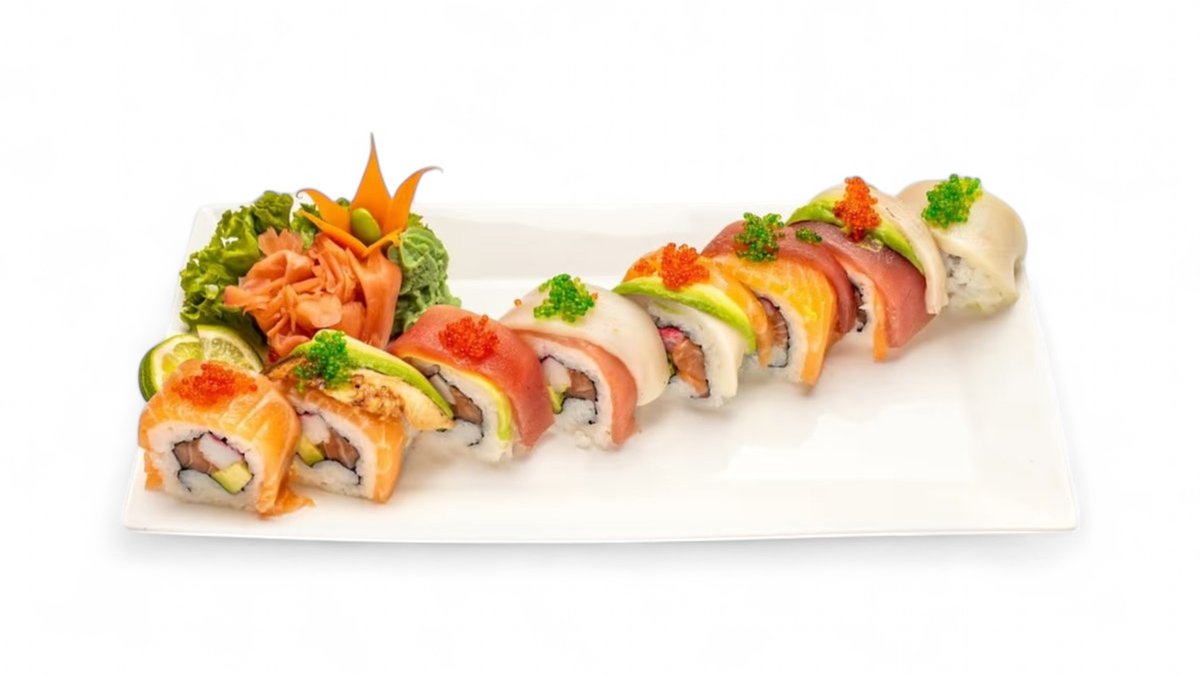 Sushi rolka s lososom, krabou tyčinkou, obalená lososom, tuniakom, maslovou rybou, úhorom, avokádom a kaviárom 8ks (2,4,11)