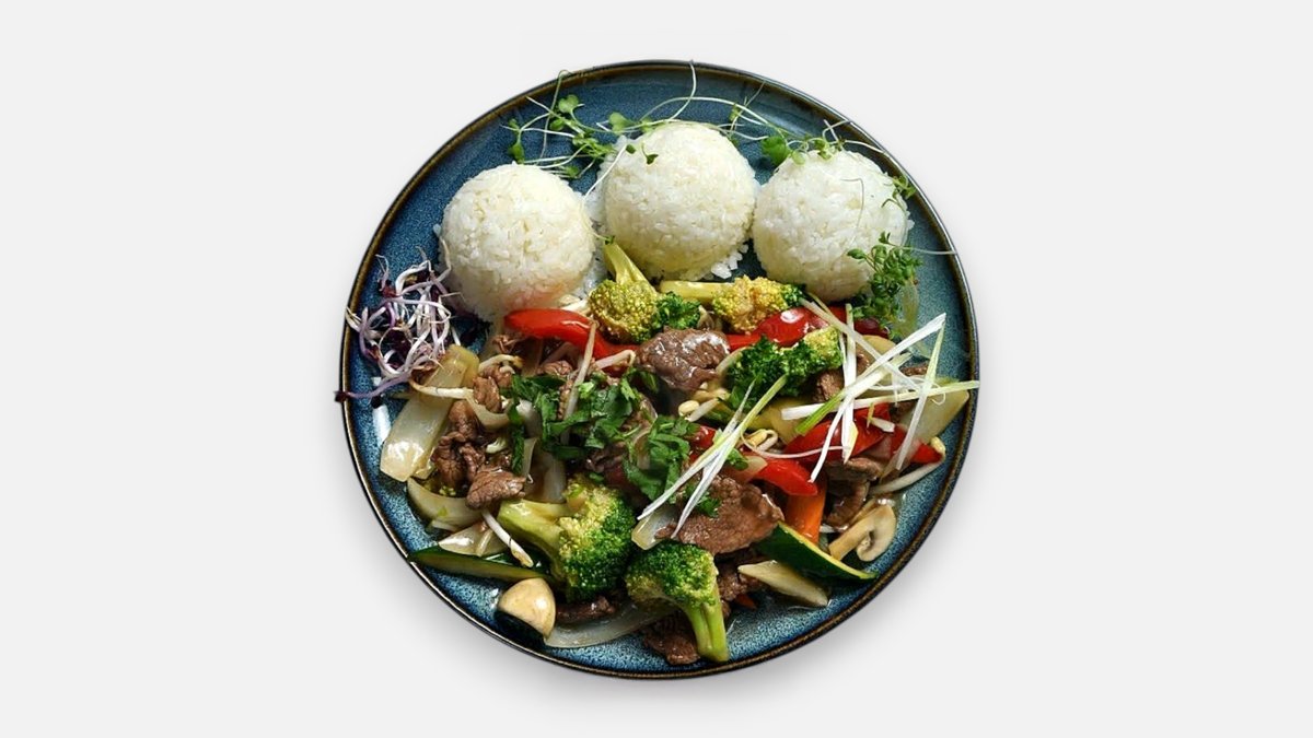 Hovädzie mäso (100g) s hubami, zeleninou a mungo klíčkami na šťave, dušené cibuľkou 200g/obsahuje: 11