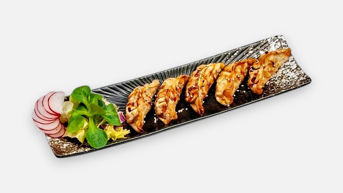 taštičky plnené kuracím mäsom alebo zeleninou (variant: chicken gyoza alebo vege gyoza) 5ks (1,3,11)