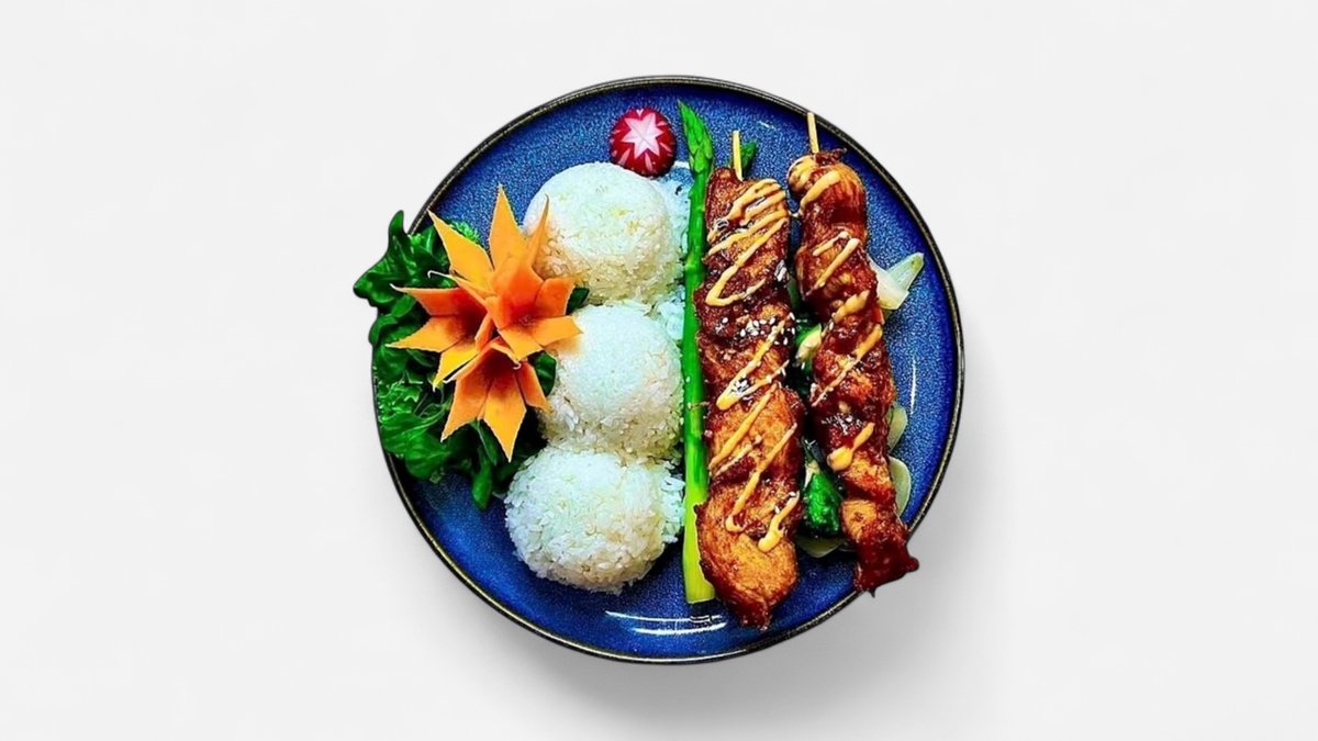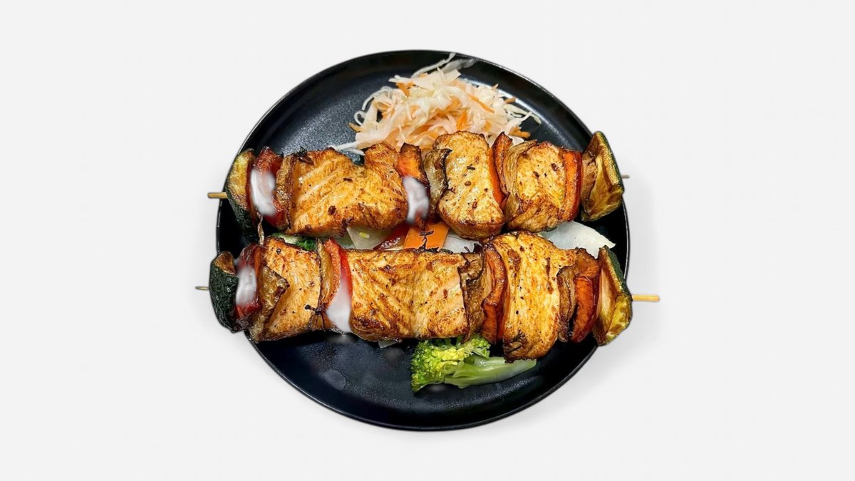 2 ks špízov s lososom na zelenine, cukete, podávané s domácou teriyaki omáčkou. 220g / obsahuje: 4,6,11