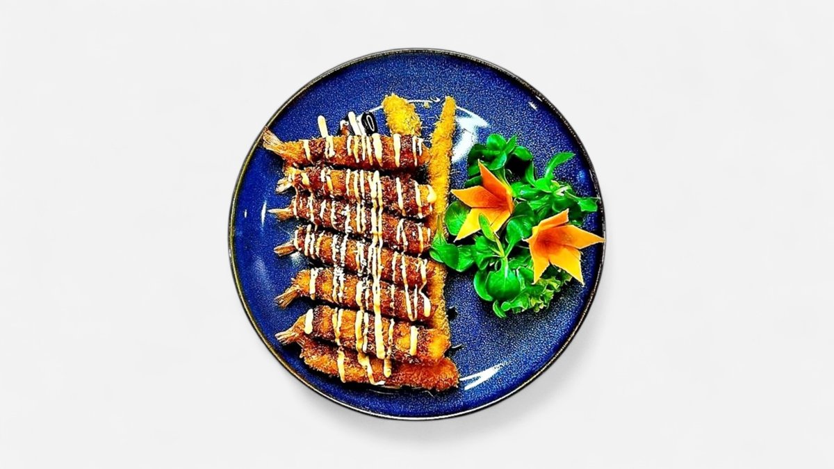 Chrumkavé krevety v tempure podávané na japonskom cestíčku, poliate ocean omáčkou, zelenina. 200g / obsahuje: 1,2,3,6,10,11