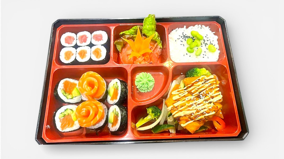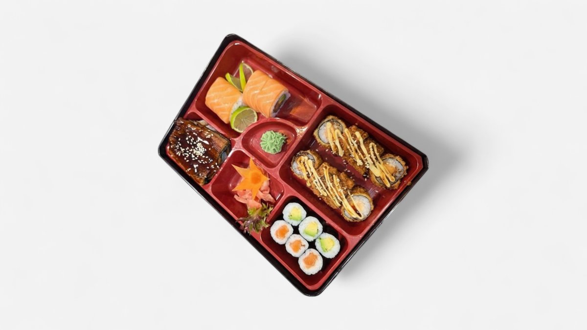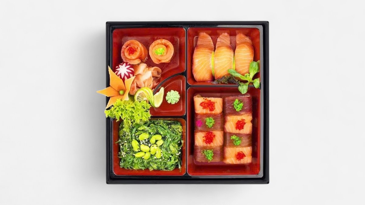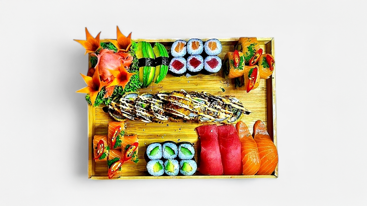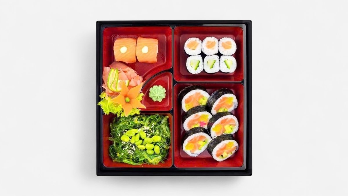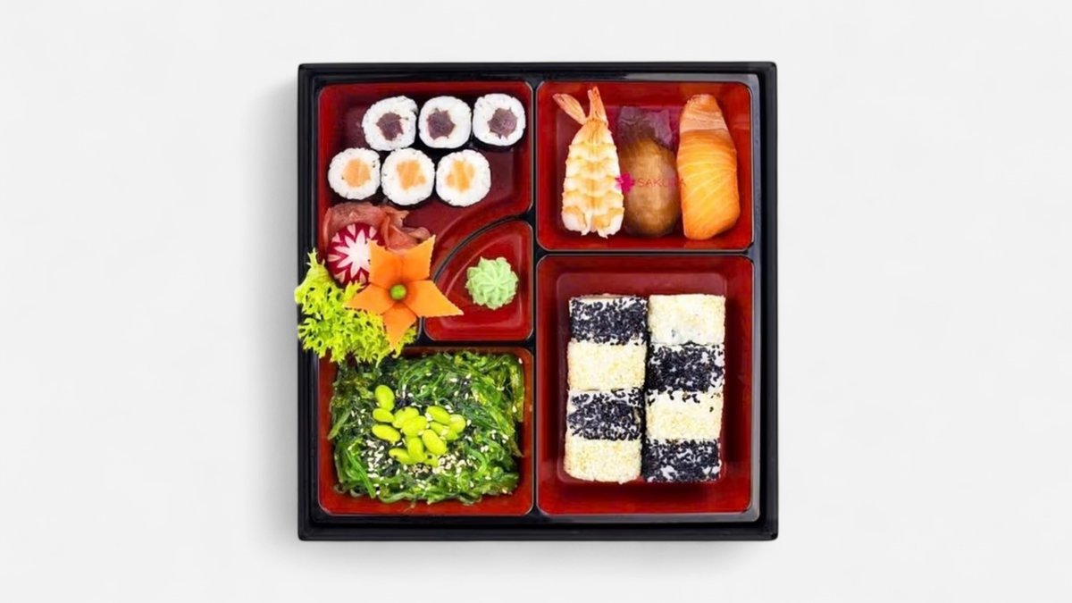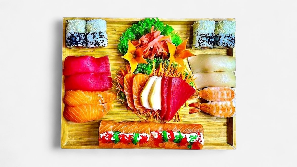 Nigiri: 2ks losos, 2ks maslová ryba, 2ks kreveta, 2ks tuniak. Sashimi: 2ks losos, 2ks tuniak, 2ks maslová ryba. Uramaki: 1ks rolka podľa výberu