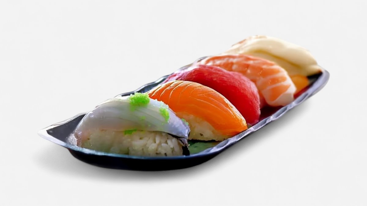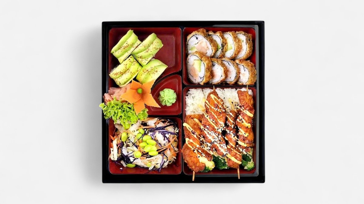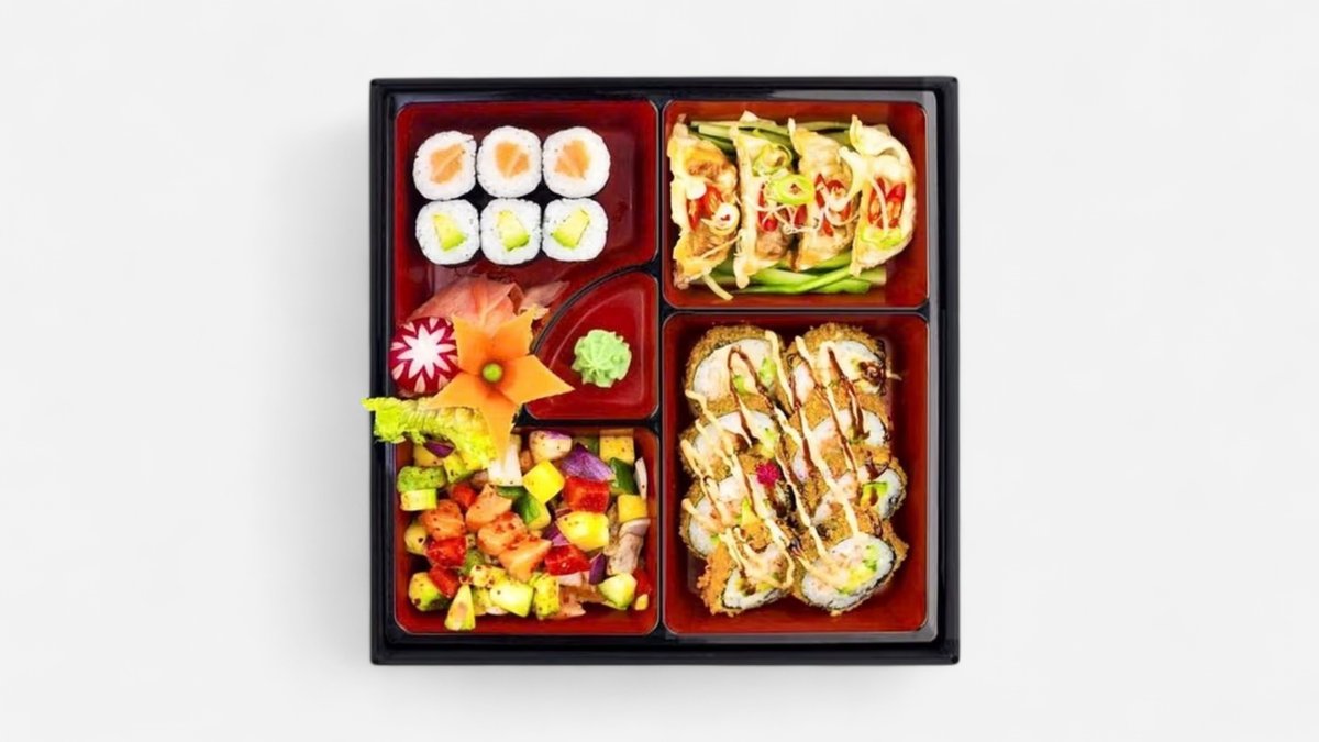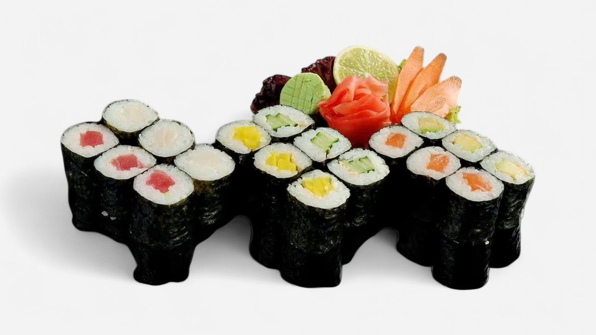 Nigiri: 2ks losos, 2ks avokádo, 2ks tuniak. Maki: 3ks losos, 3ks tuniak. Cheesy Maki: 3 ks uhorka s krémovým syrom, 3ks avokado s krémovým syrom. Uramaki