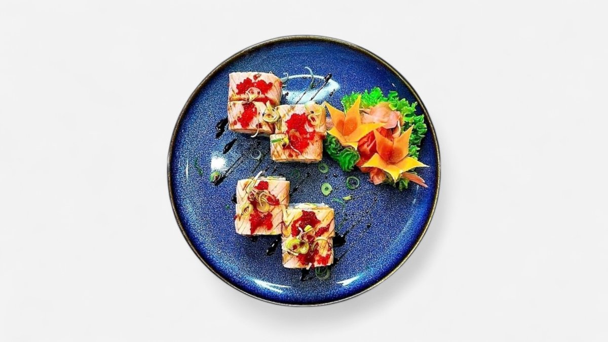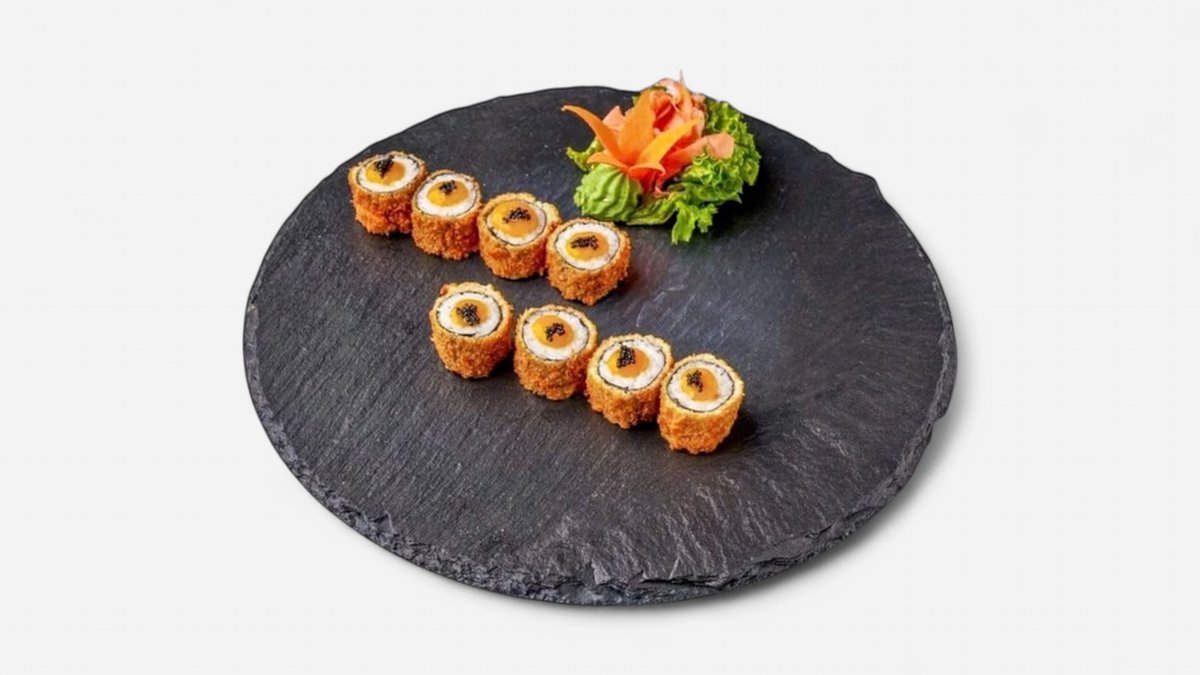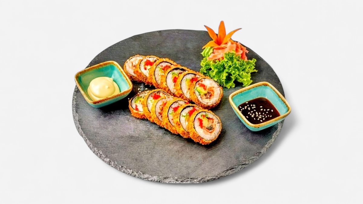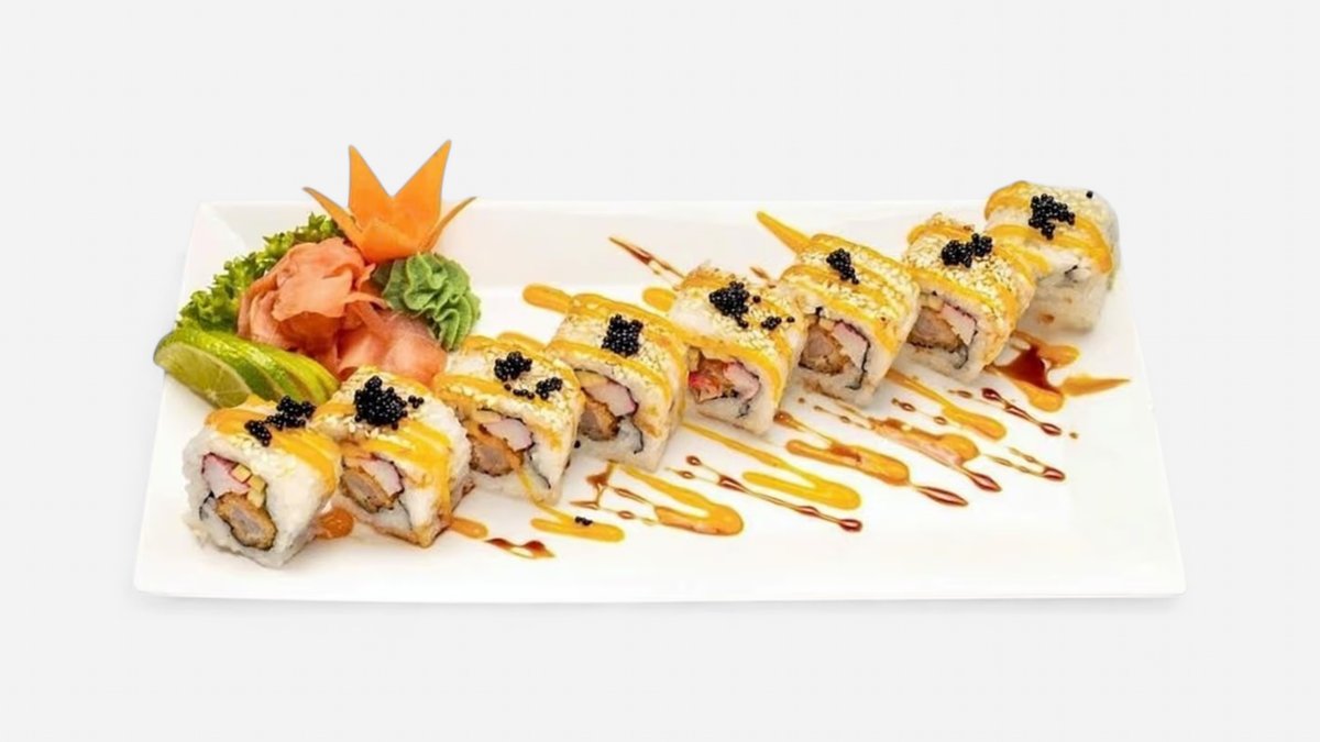 Tempurovaná rolka s lososom, údeným úhorom, philadelphiou, avokádom, ocean omáčkou, japonskou majonézou, sezamom a kaviárom. 12ks (1,3,4,6,7,10,12)