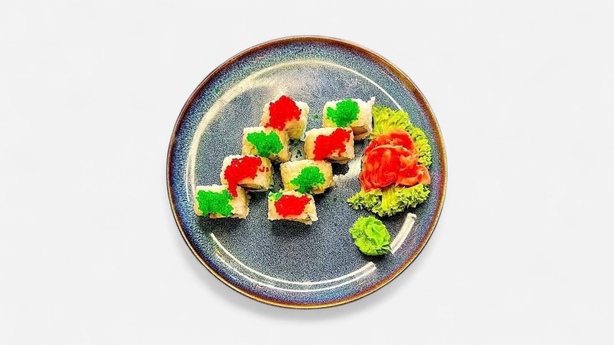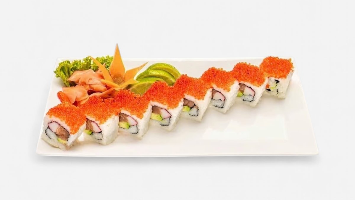 Rolka s krevetou v tempure, avokádom, mrkvou, uhorkou, šalátom a ikura kaviárom, poliate majonézou. 10ks (1,3,4,6,7,10,12)
