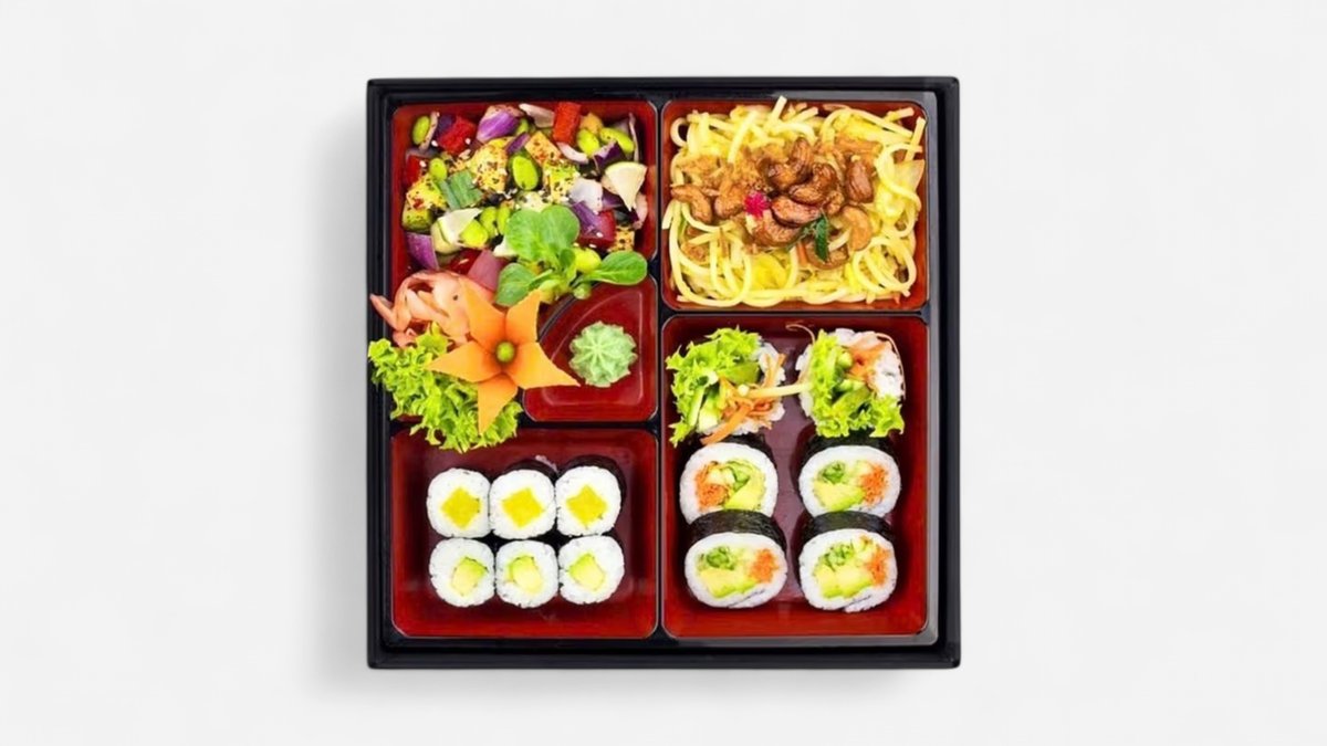 100g opekané rezance s kešu, 6ks futomaki vegetarian, 6ks maki, 1x vege poke bowl šalát 280g (1,3,8,11)