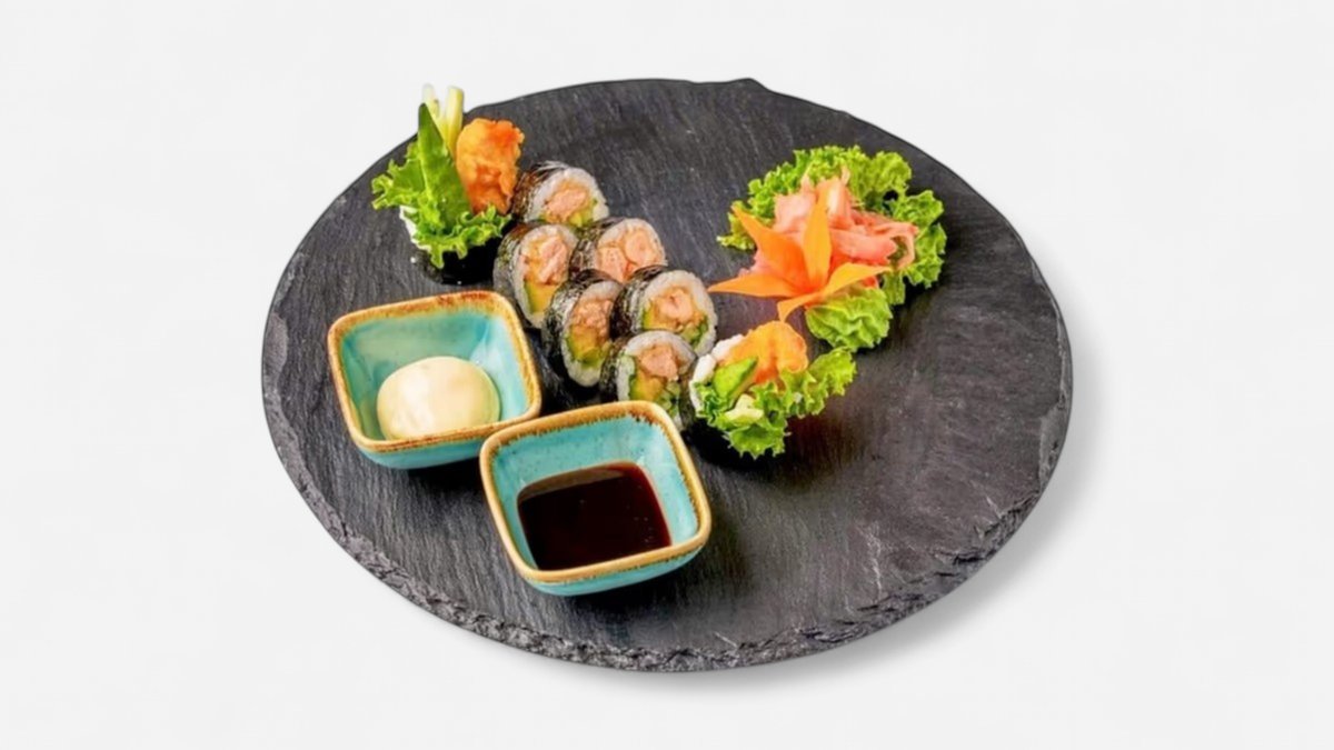 Futomaki: 1x 6ks crunchy roll light, 6ks sashimi rossa s kaviárom, Uramaki: 1x 8ks salmon roll a 1x rolka podľa výberu (napísať do poznámky)