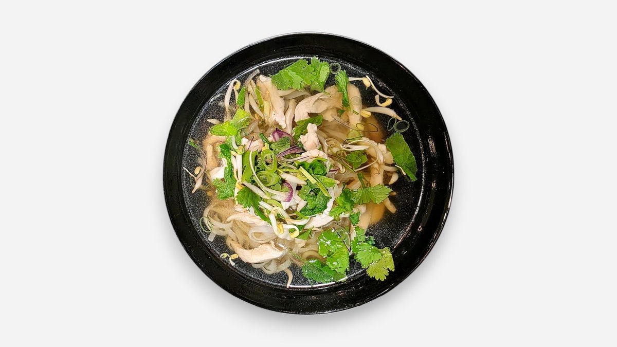 Vývar na vietnamský spôsob s ryžovými rezancami, kuracím mäsom, koriandrom, jarnou cibuľkou. (0,31)