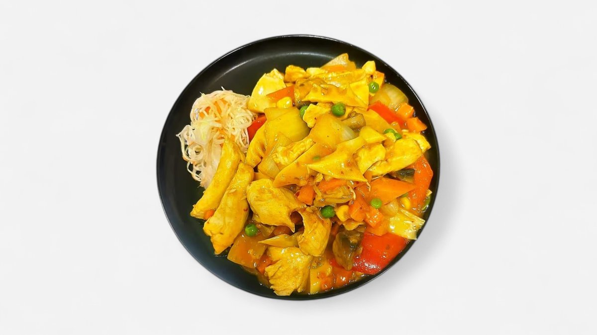Kuracie prsia (90g) na stave so zeleninou a hubami, dochutené kari korením a kokosovým mliekom, na pikantný spôsob 150g/obsahuje: 6,10,11
