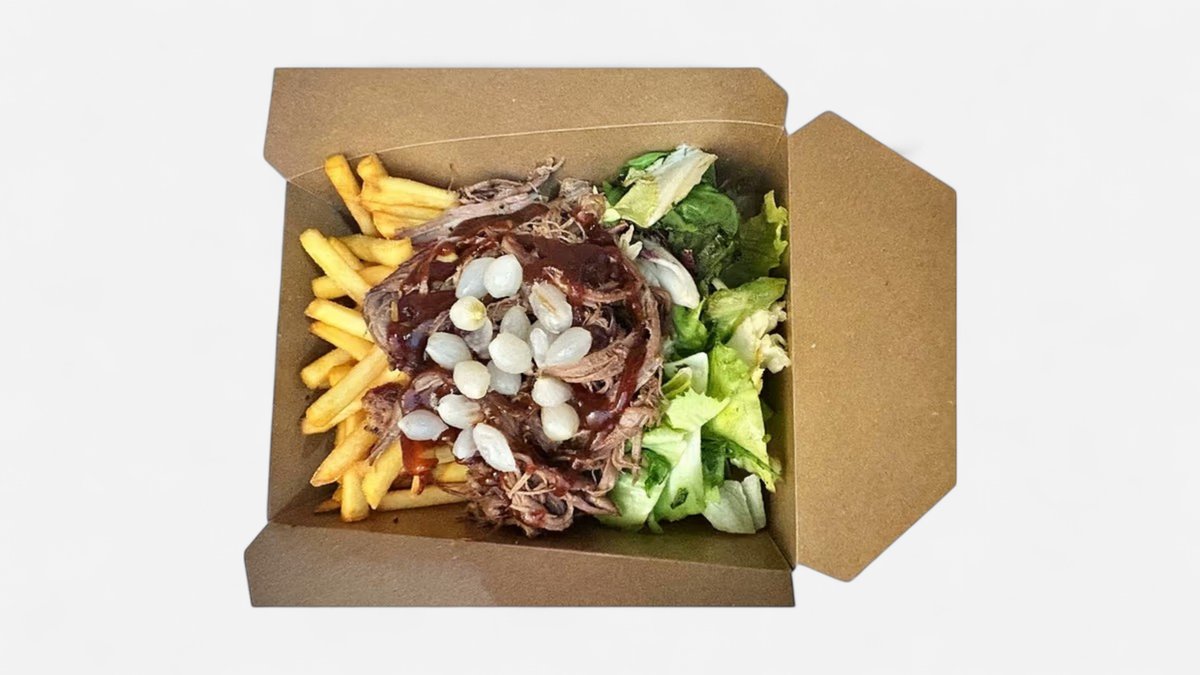 Box s bravčovým mäsom, hranolkami a zeleninou podľa texaského receptu 13 hodín grilované trhane maso